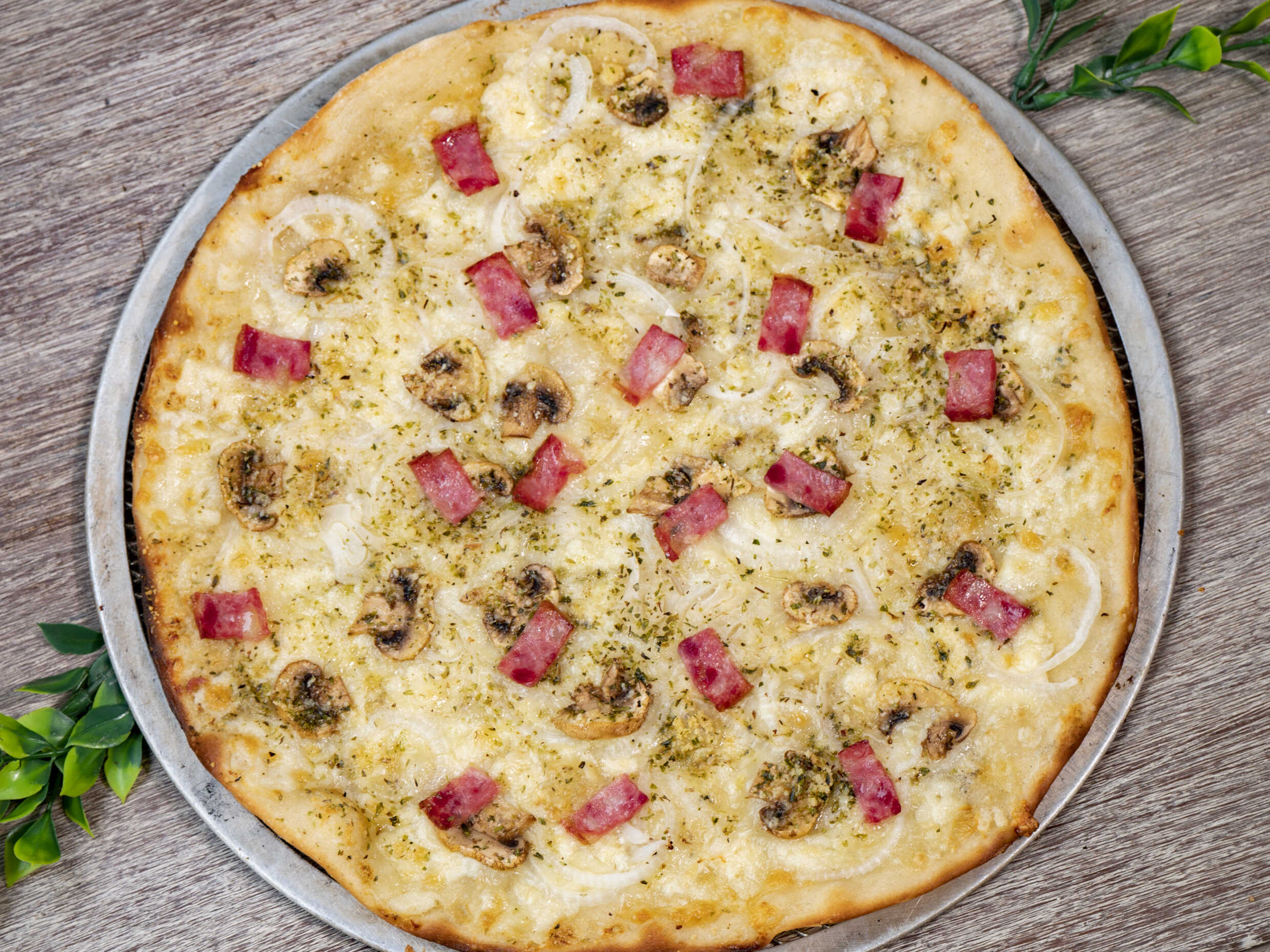 Pizza en masa artesanal de 30 cm, crema de leche, mozzarella, tocino, champiñón, cebolla blanca, parmesano y orégano.
