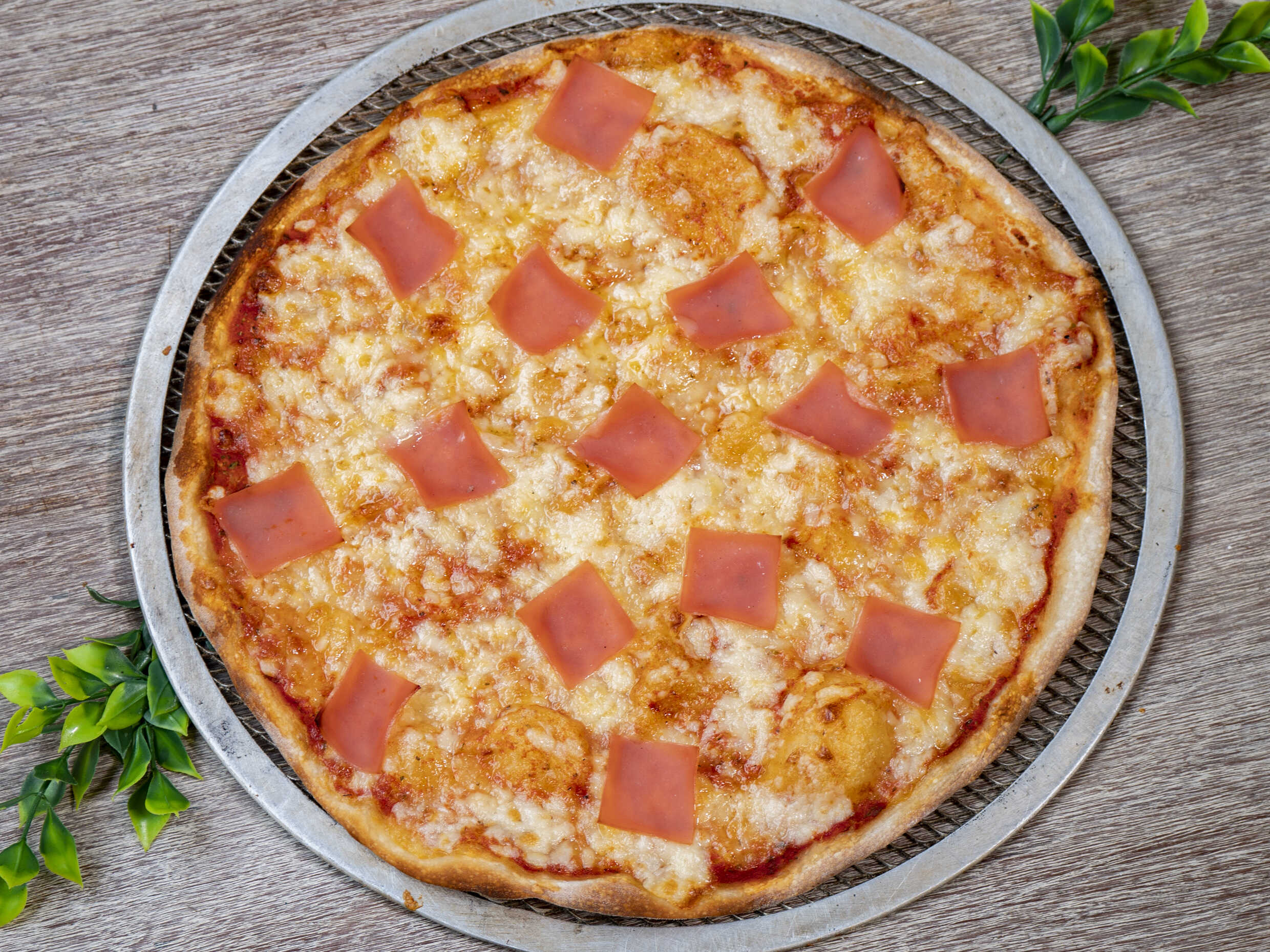Pizza en masa artesanal de 36 cm, salsa de tomate italiana, mozzarella, jamón y piña.