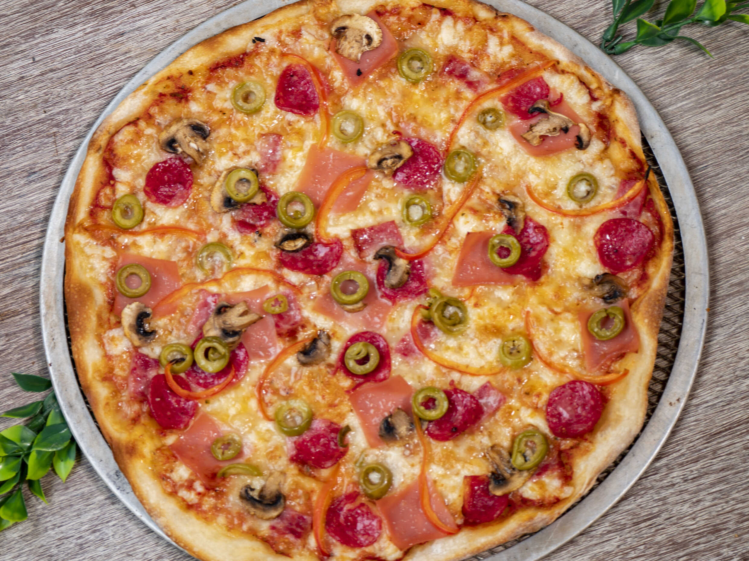 Pizza en masa artesanal de 30 cm, salsa de tomate italiana, mozzarella, jamón, tocino, chorizo, champiñón, pimiento y aceitunas verdes.