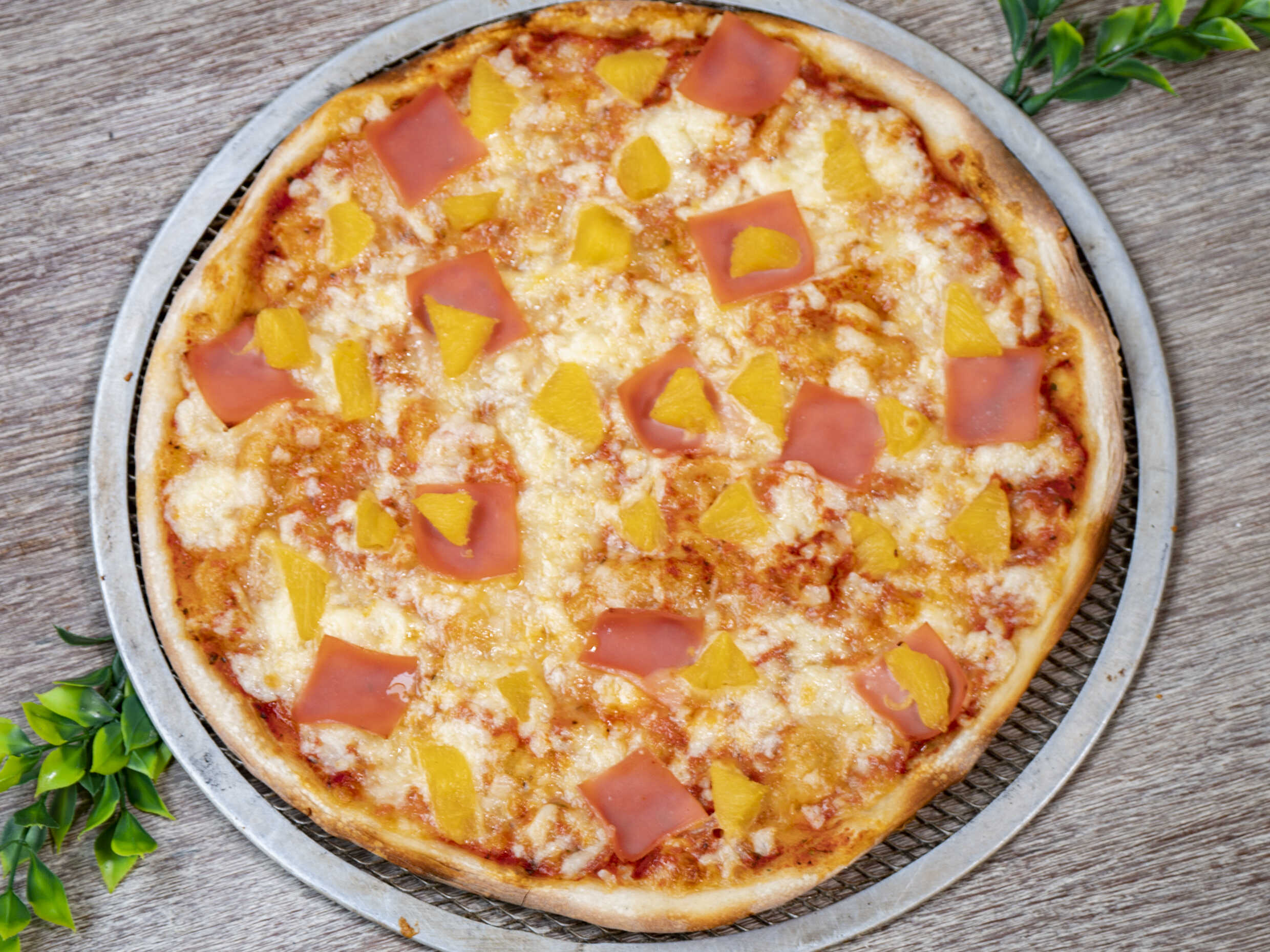 Pizza en masa artesanal de 30 cm, salsa de tomate italiana, mozzarella, jamón y piña.