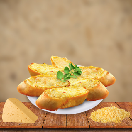 06 panes de Baguette, untados con margarina, ajo, aceite de oliva. Mozzarella y orégano.