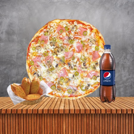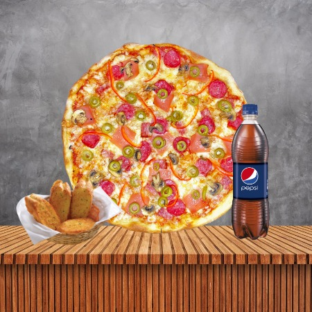 Pizza Caprichosa Tamaño XL*1 + Pepsi 750 ml*1 + Pan al Ajo 04 Unidades*1