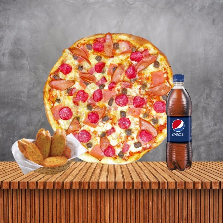 Pizza Meat Tamaño XL*1 + Pepsi 750 ml*1 + Pan al Ajo 04 Unidades*1