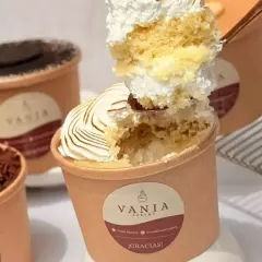 Keke Red Velvet humedecido con almíbar en una primera capa y rellenado con crema de queso. Otra capa de keke con crema frosting y cubierta de la misma crema espolvoreada de miga de keke.