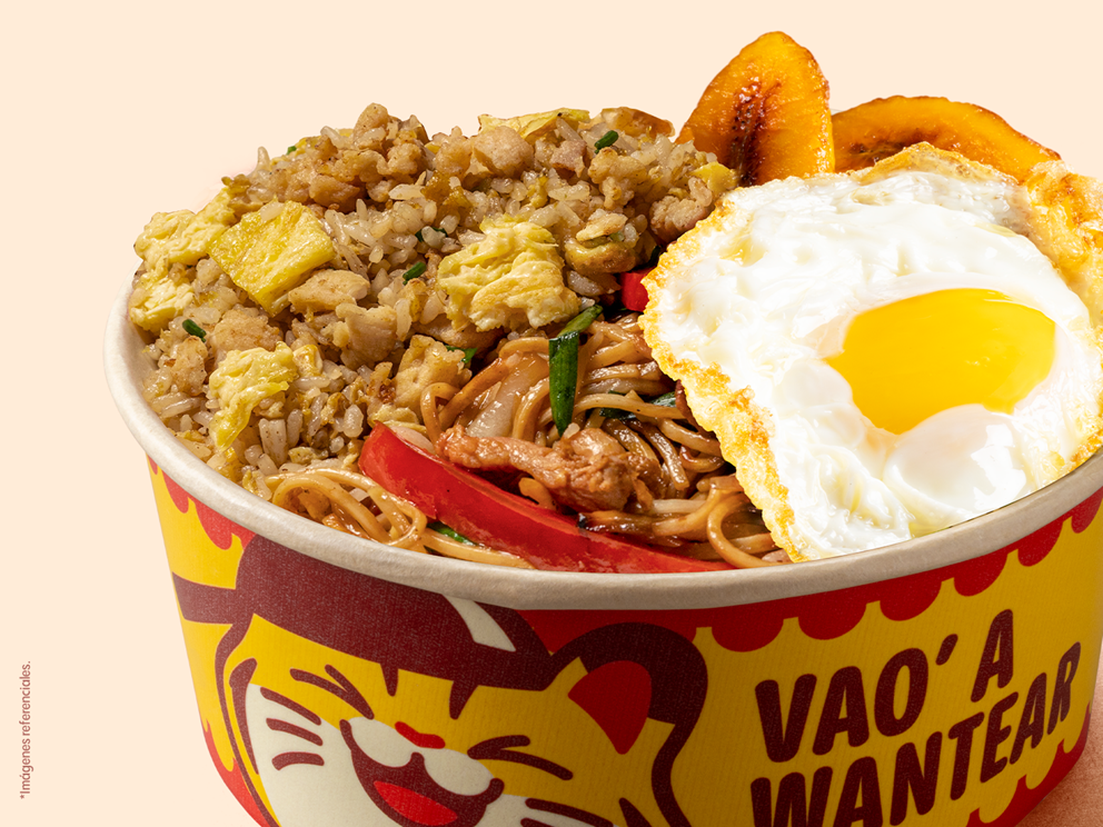 Ármalo como a ti te guste. Base de chaufa. De tallarín saltado. ¡O de las dos cosas! Y puedes sumarle hasta dos fondos (Pollo Tipakay, Chijaukay, Cruyok, Picante o Chancho al Ajo). Viene con su infaltable gaseosa.