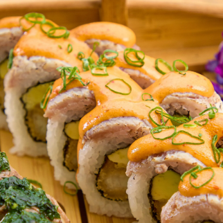 10 Maki Relleno de pescado furai y palta cubierto con salsa spicy sopleteado