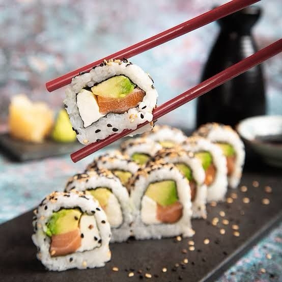 10 Maki Relleno de palta, queso crema y pescado furai y cubierto con ajonjolí negro