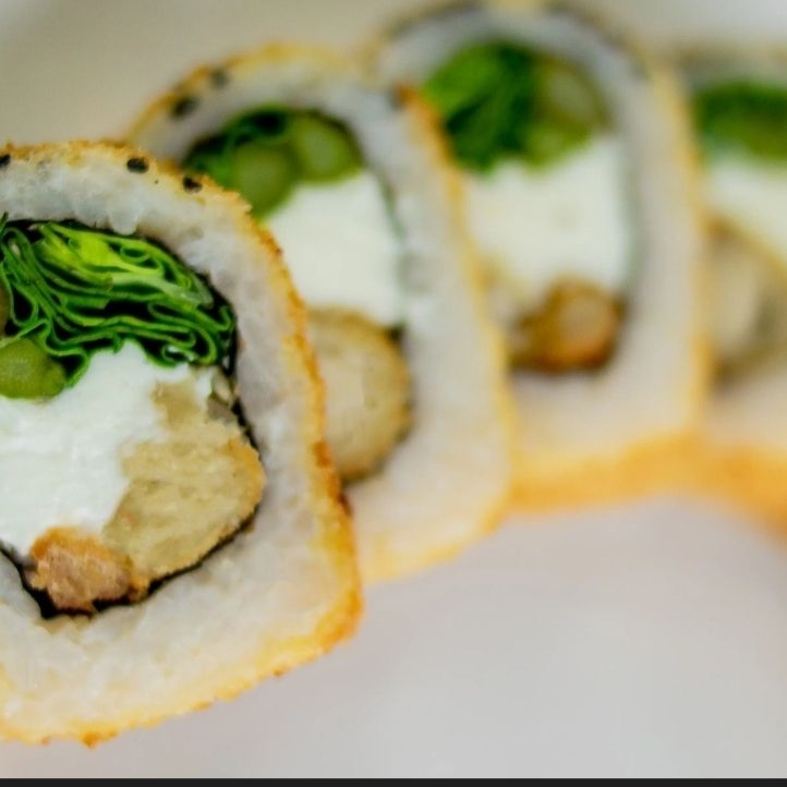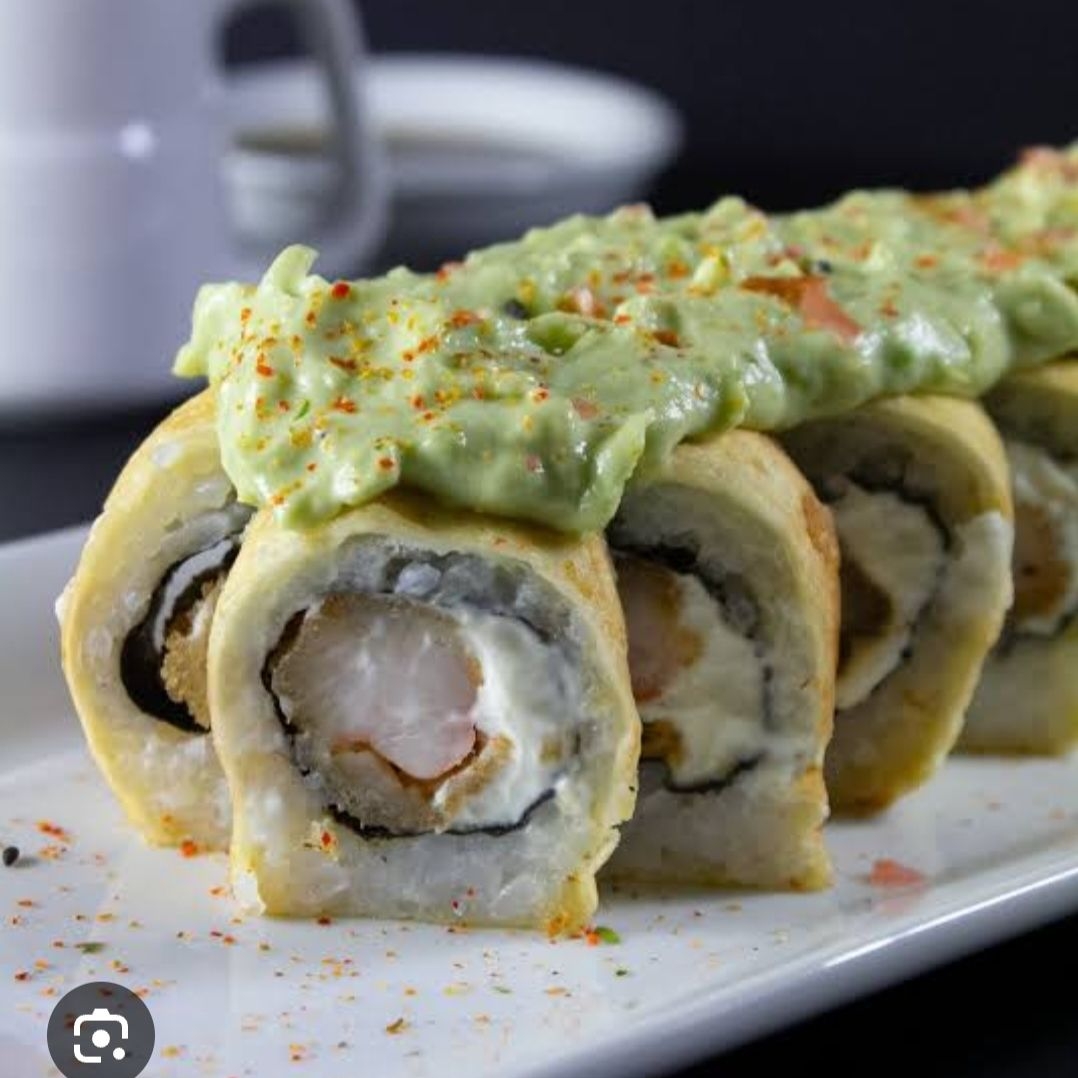 10 Maki Relleno de pescado furai y queso crema cubierto con láminas de wantán y guacamole