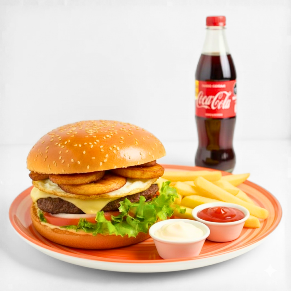 Hamburguesa casera con tremendos 200g carne de res, jamón, queso cheddar, huevo frito, plátano frito, tomate, cebolla blanca, lechuga y cremas + papas fritas + gaseosa medio litro