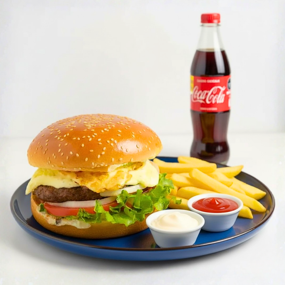 Hamburguesa casera con tremendos 200g de carne de res, jamón, queso cheddar, huevo frito, tomate, cebolla blanca, lechuga y cremas + papas fritas + gaseosa medio litro