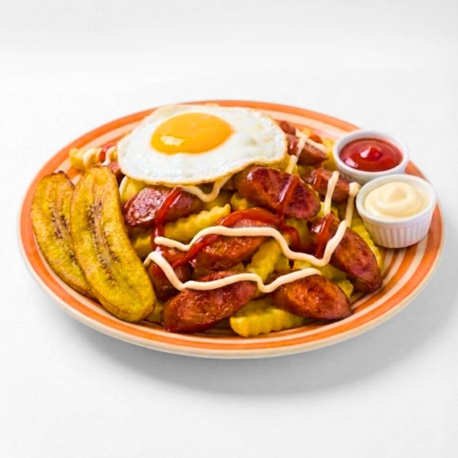 Porción personal de papas fritas, salchichas ahumadas fritas en rodajas, queso derretido, plátanos fritos y huevo frito. También llamada salchipapa a la cubana