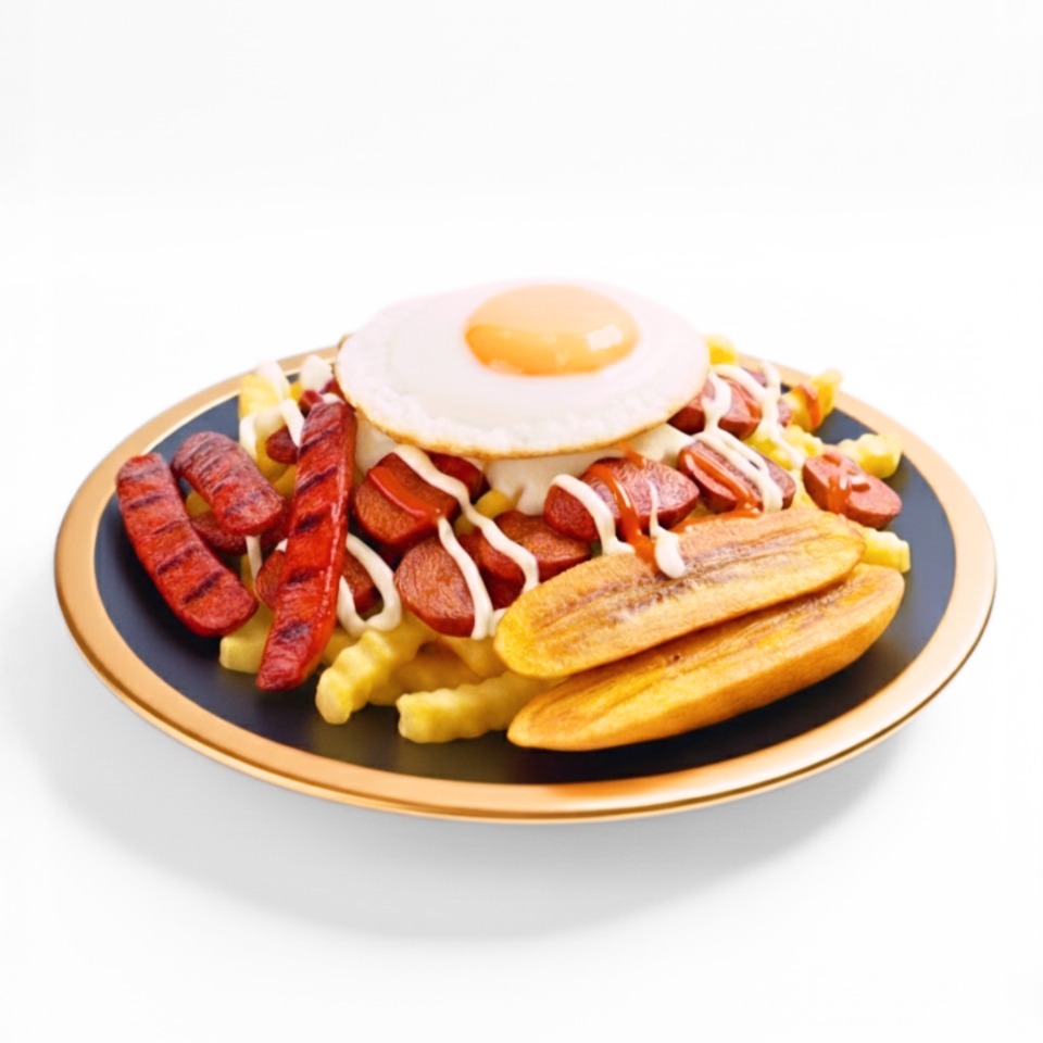 Papas fritas, salchichas ahumadas, queso dambo, huevo frito, plátano frito, chorizo parrillero, trozos de hamburguesa de carne y cremas a elección