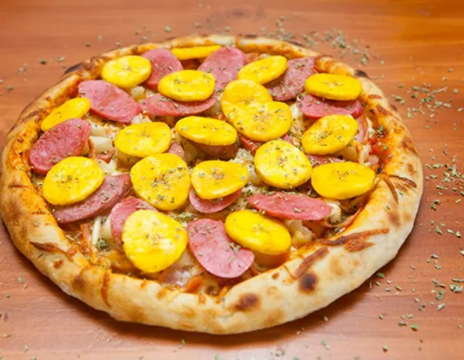 Salsa a la marinera, queso mozzarella, cecina de la selva, plátano frito, cebolla blanca, huevos fritos.