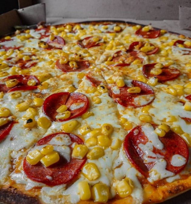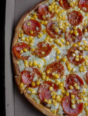 Salsa napolitana, queso mozzarella, maíz y pepperoni. 4 Porciones.