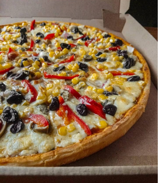 Salsa napolitana, queso mozzarella, champiñones, cebolla, pimentón y maíz. 4 Porciones.