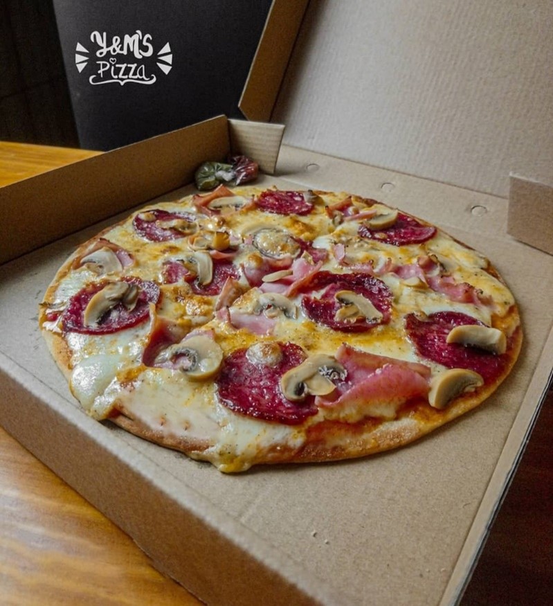 Salsa napolitana, queso mozzarella, champiñones, jamón y salchichón. 4 Porciones.