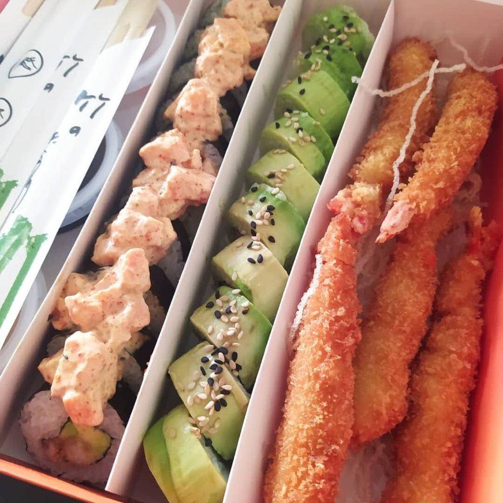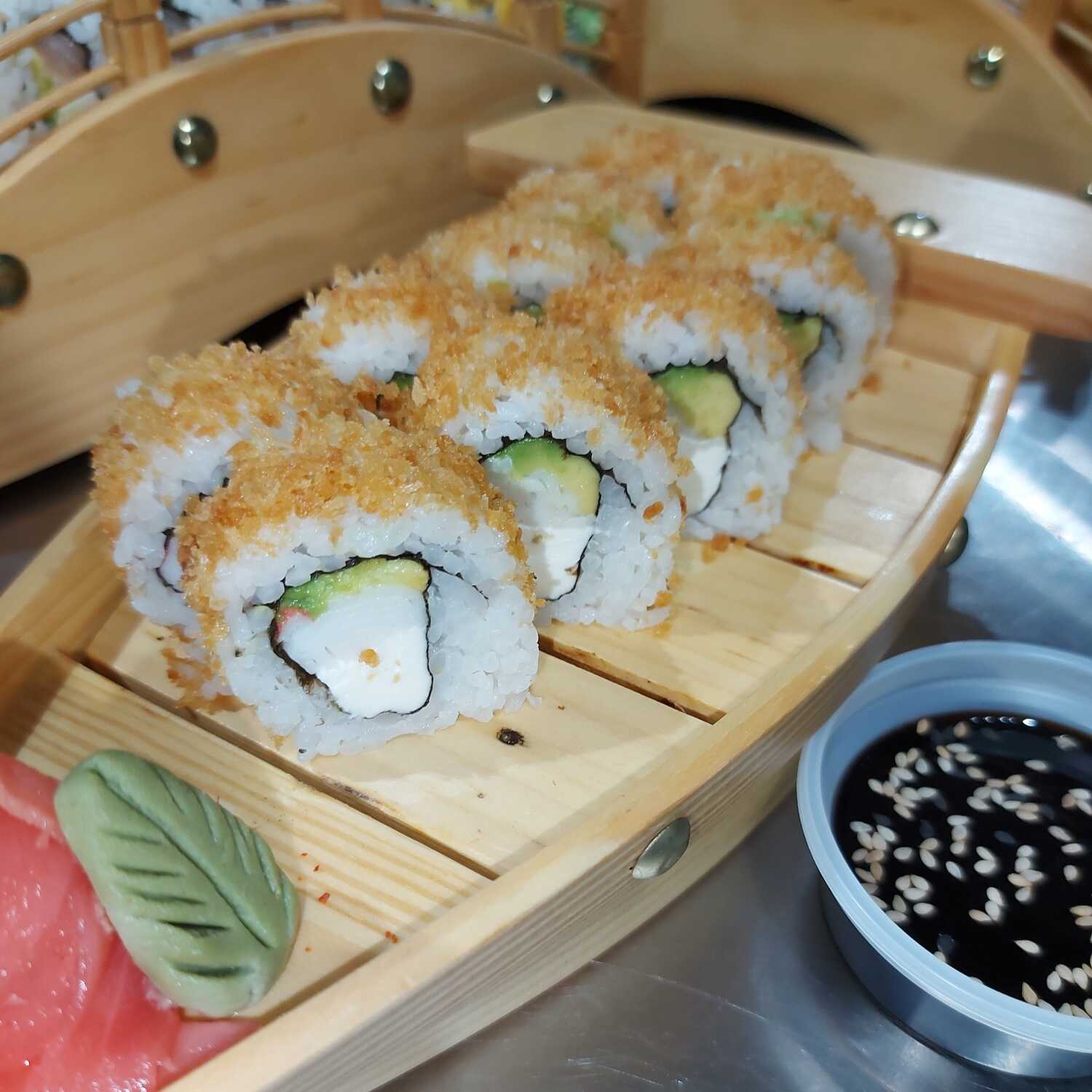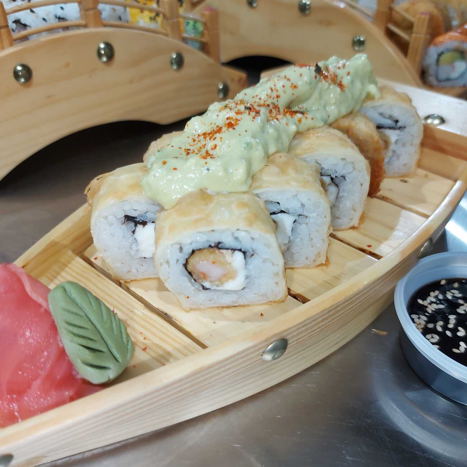 Rollo de 10 piezas con ebi furai, queso crema, envuelto en masa wantán y acompañado de guacamole.