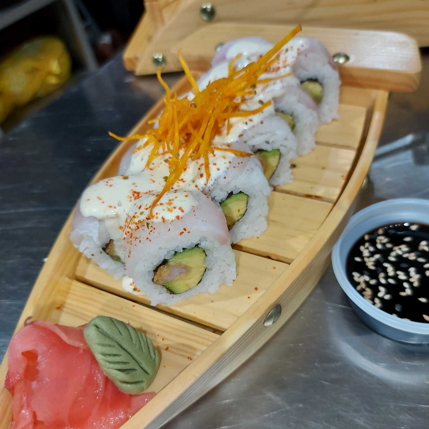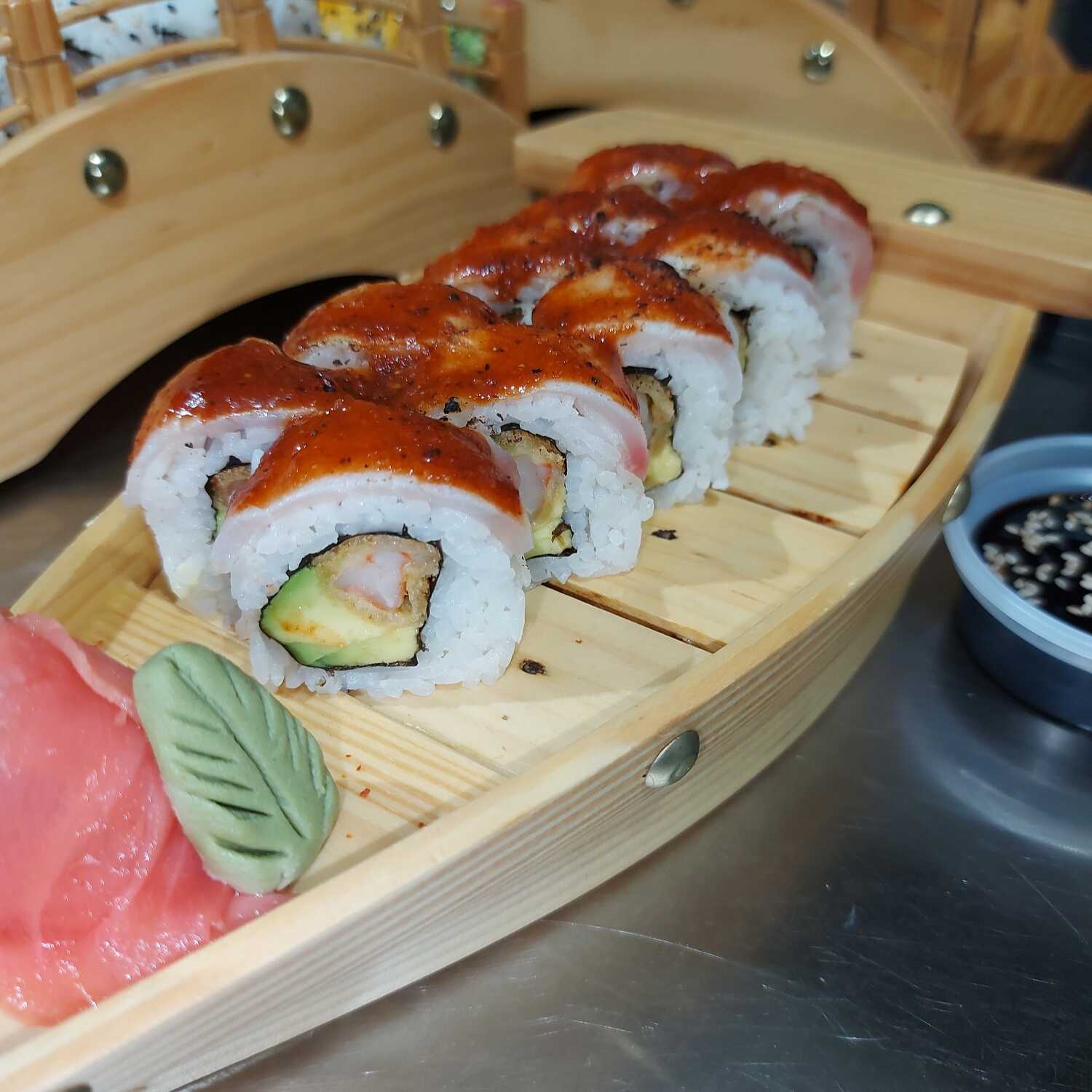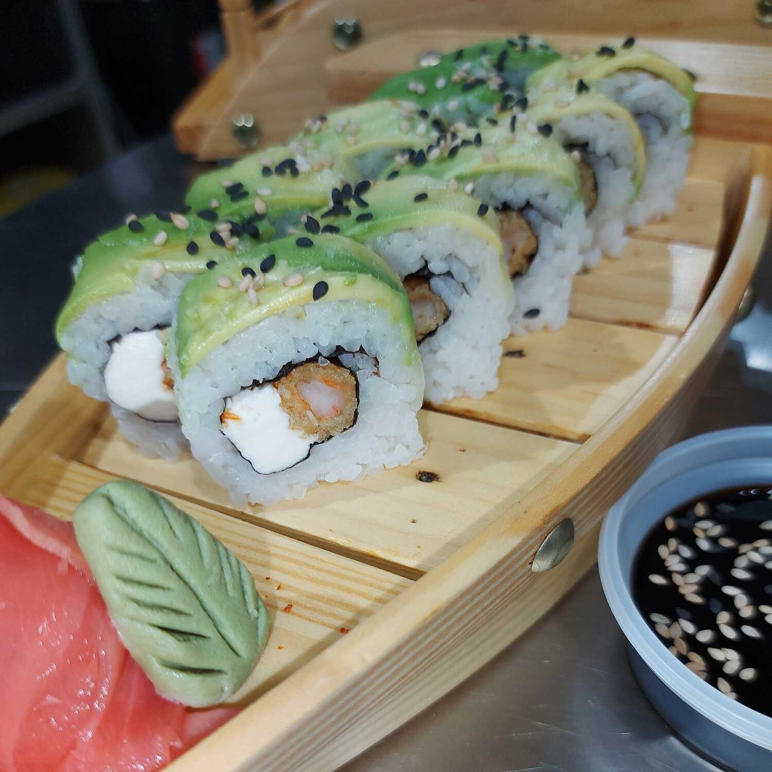 Rollo de 10 piezas con ebi furai, palta, envuelto en láminas de pescado y salsa parrillera flameada.
