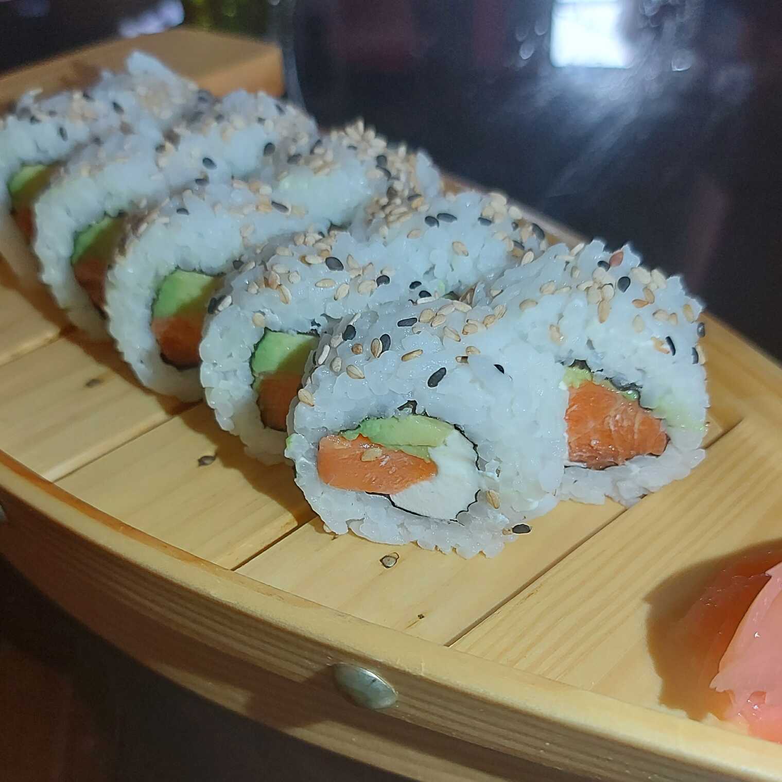 Rollo de 6 piezas con salmón, queso crema, palta y semillas de ajonjolí.