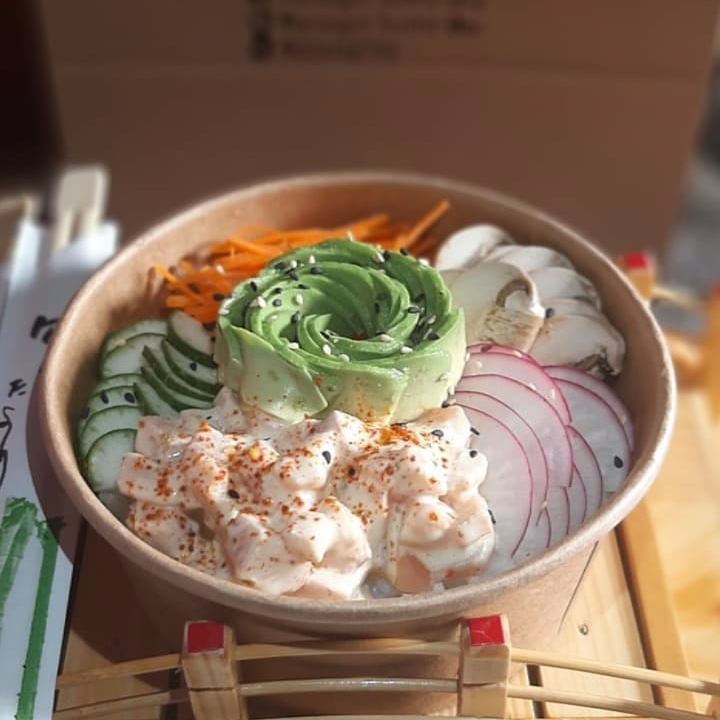 Poke con pepino, zanahoria, col morada, tomate, base de shari y tartar de salmón.