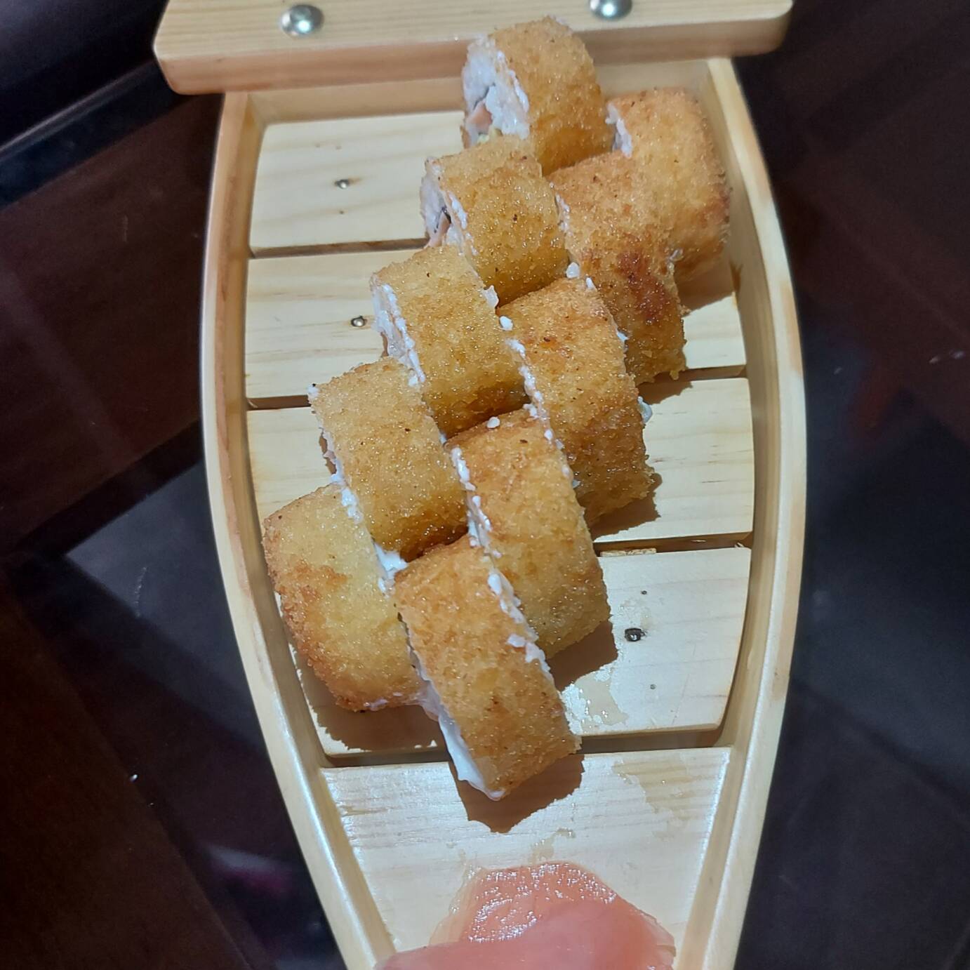 Rollo de 10 piezas con queso crema, trucha ahumada, palta, envuelto en tenkatsu y salsa de maracuyá.
