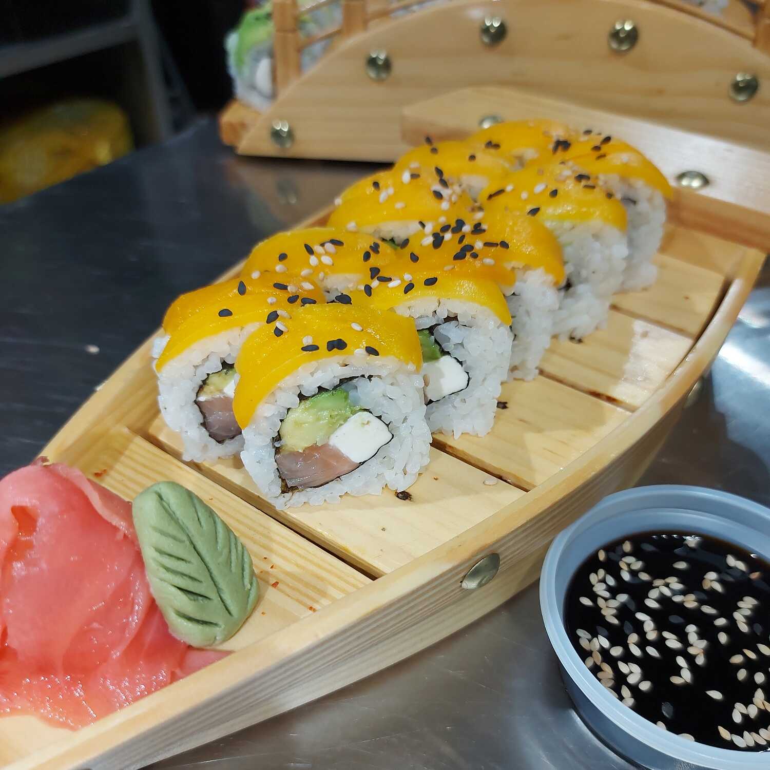 Rollo de 10 piezas con queso crema, salmón, palta, envuelto en láminas de mango y salsa de maracuyá.