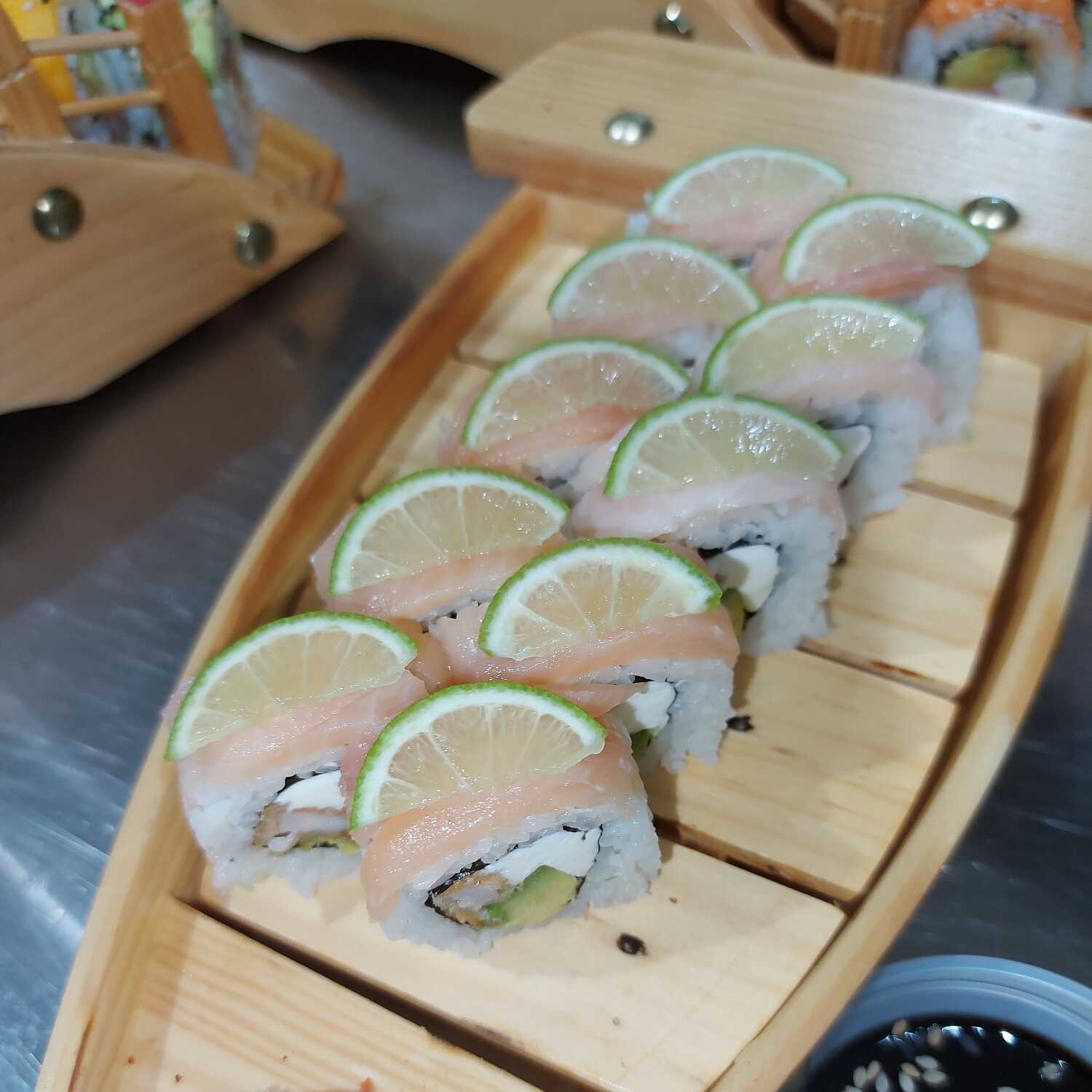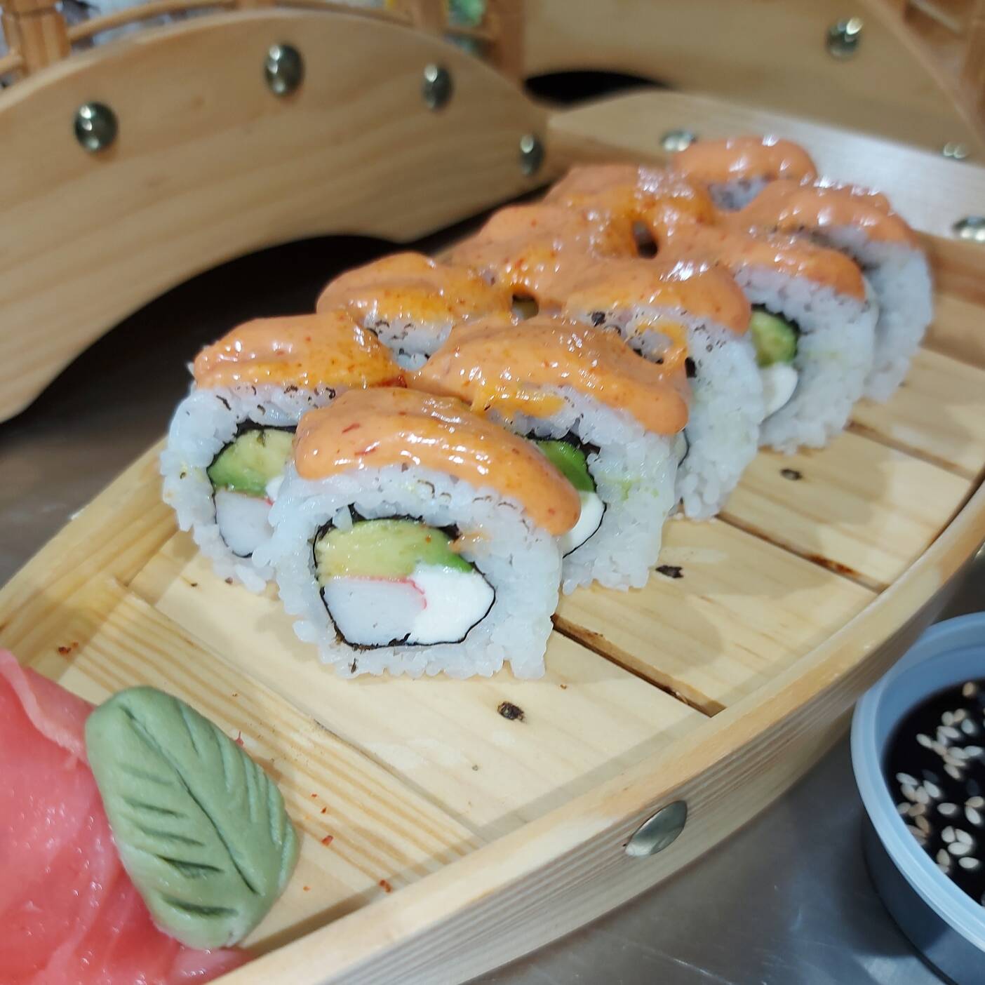 Rollo de 10 piezas con queso crema, langostino y palta, en salsa spicy flameado.