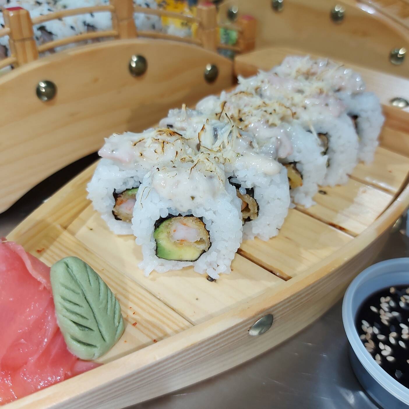 Rollo de 10 piezas con ebi furai, palta, en salsa de champiñones gratinados.