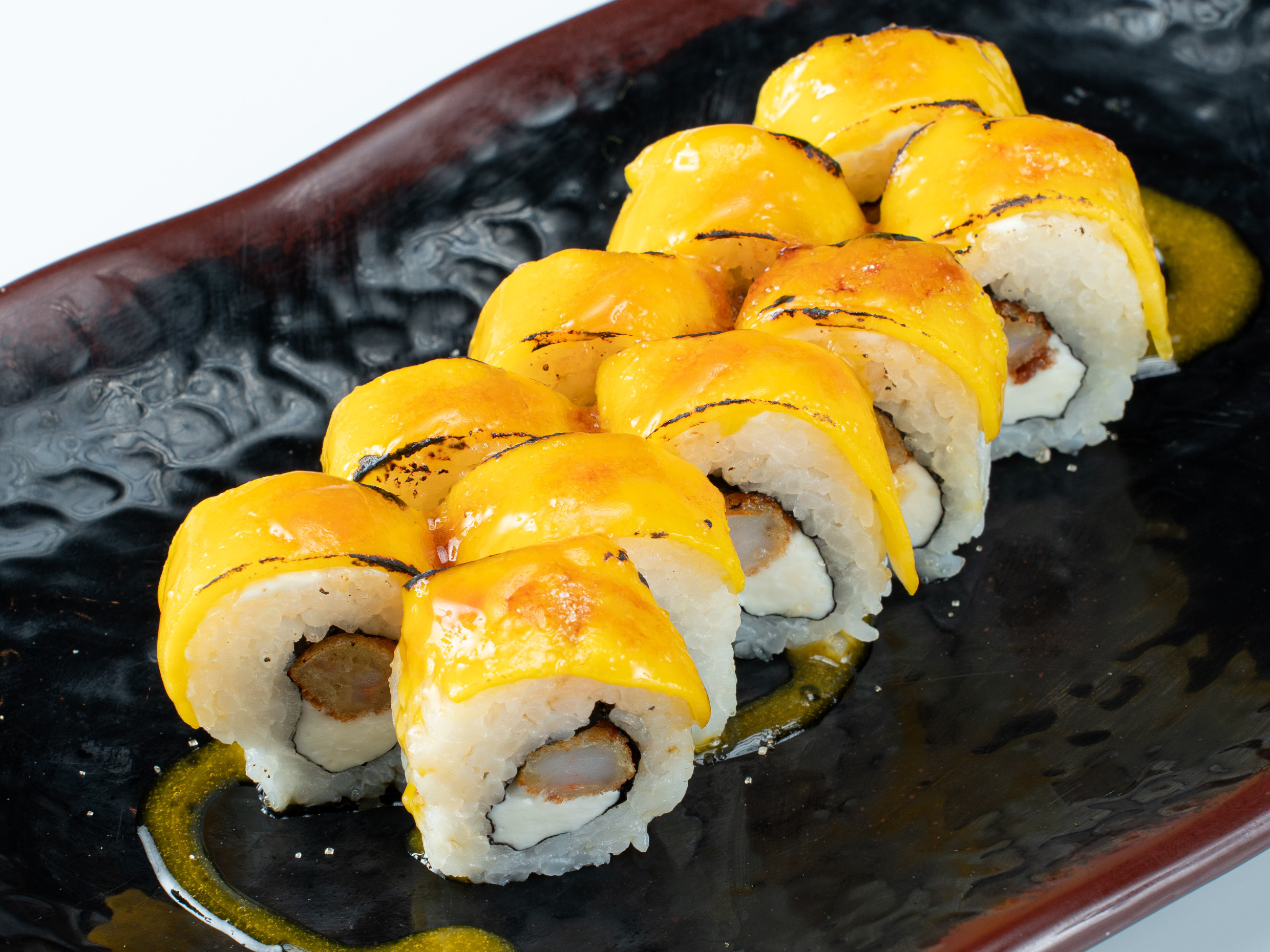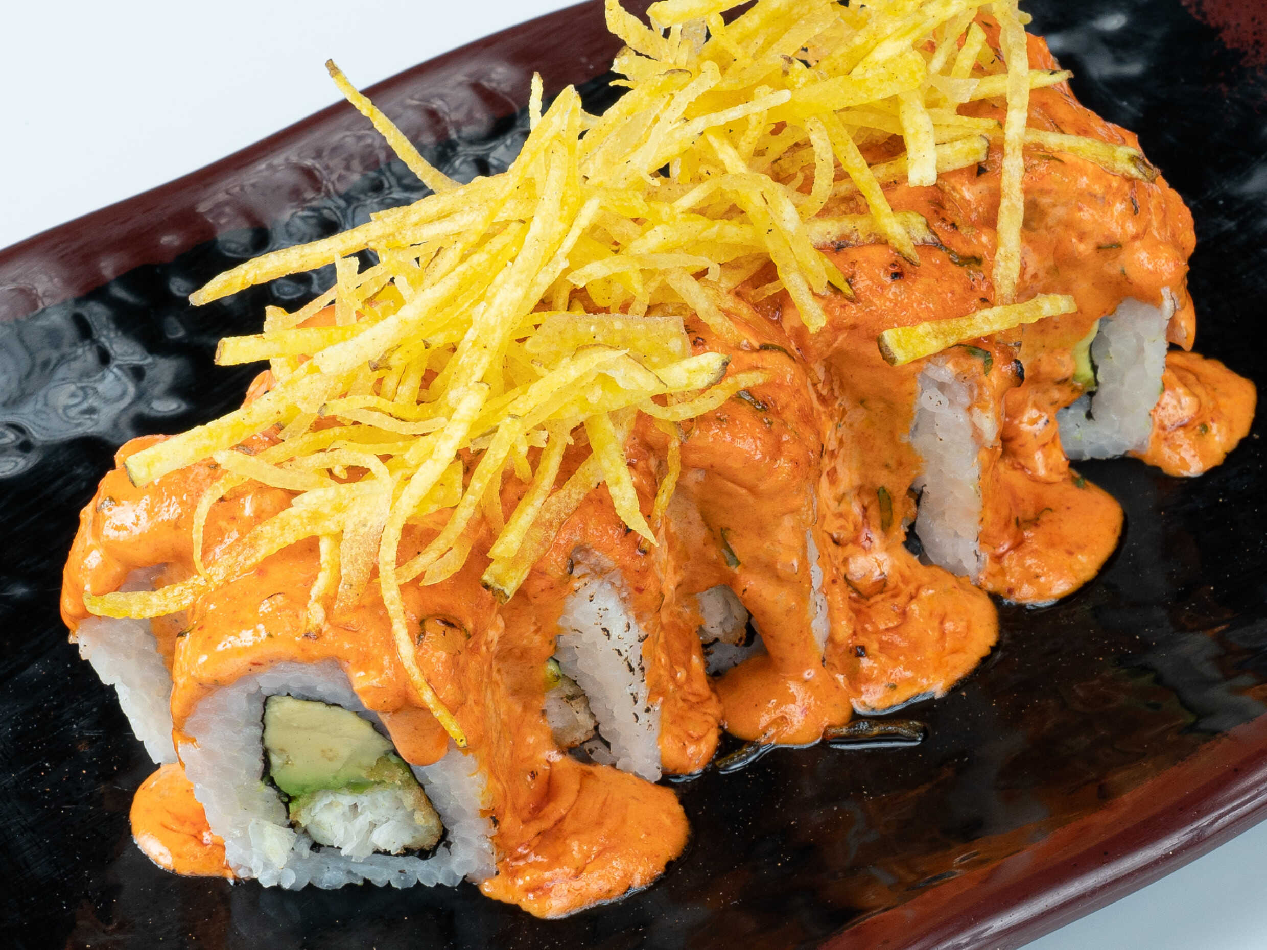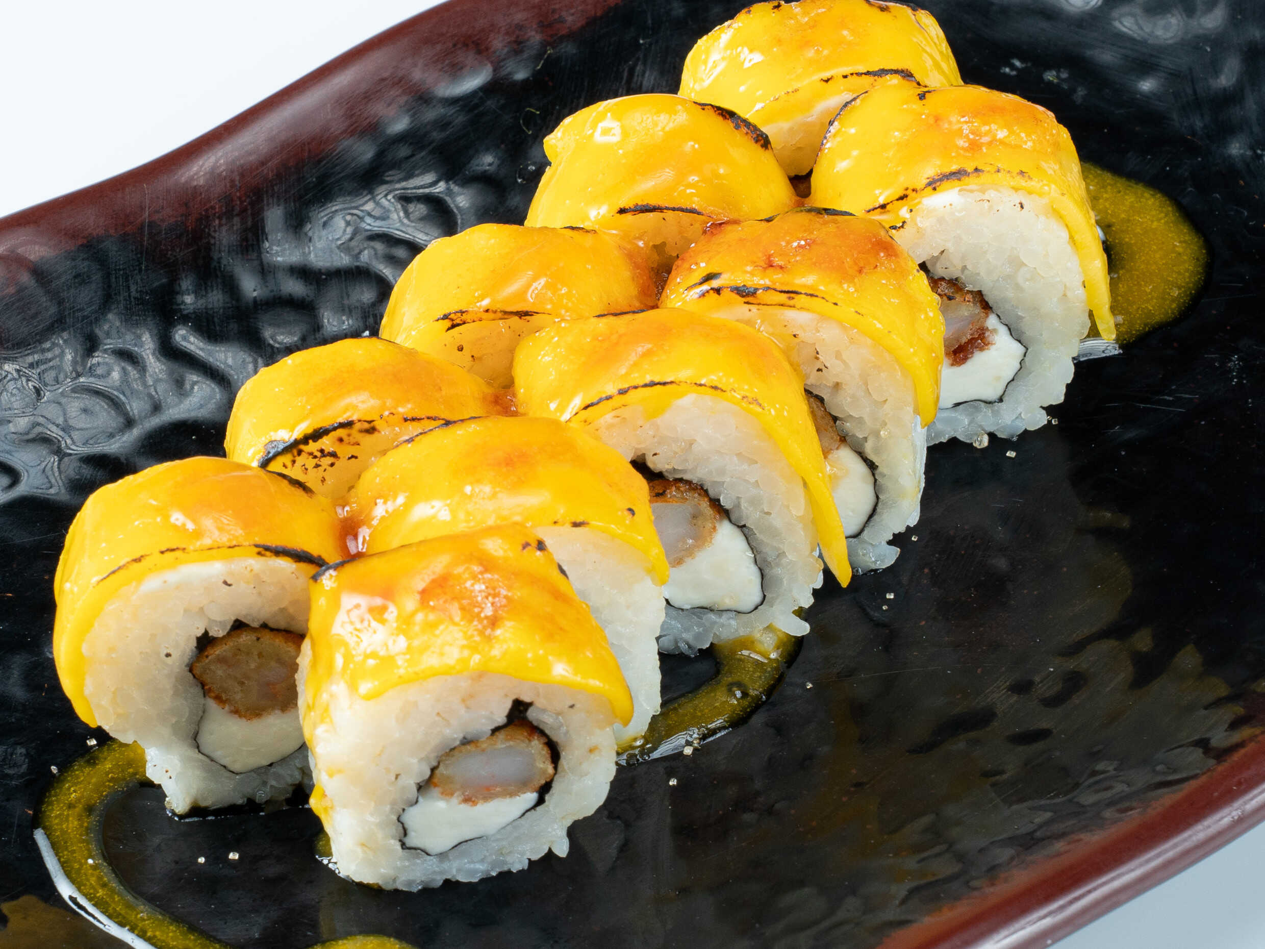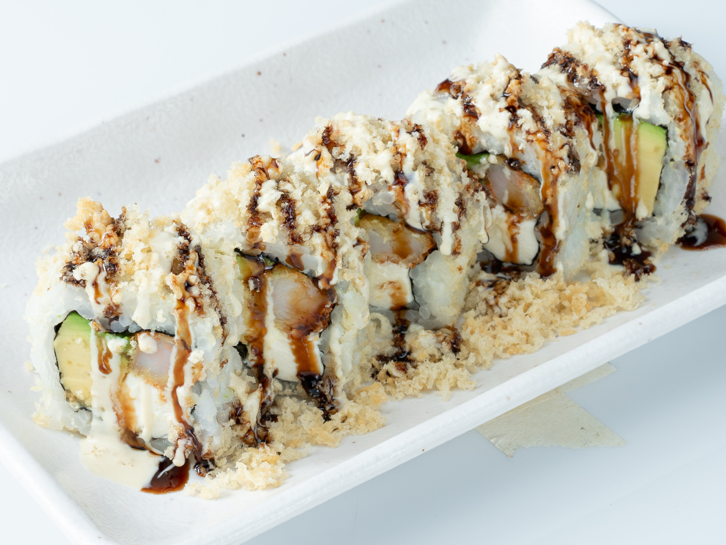 Relleno de langostino empanizado, queso cream y palta, cubierto de tenkatsu (bolitas de tempura crujientes) bañado en salsa teriyaki y wasabimayo.