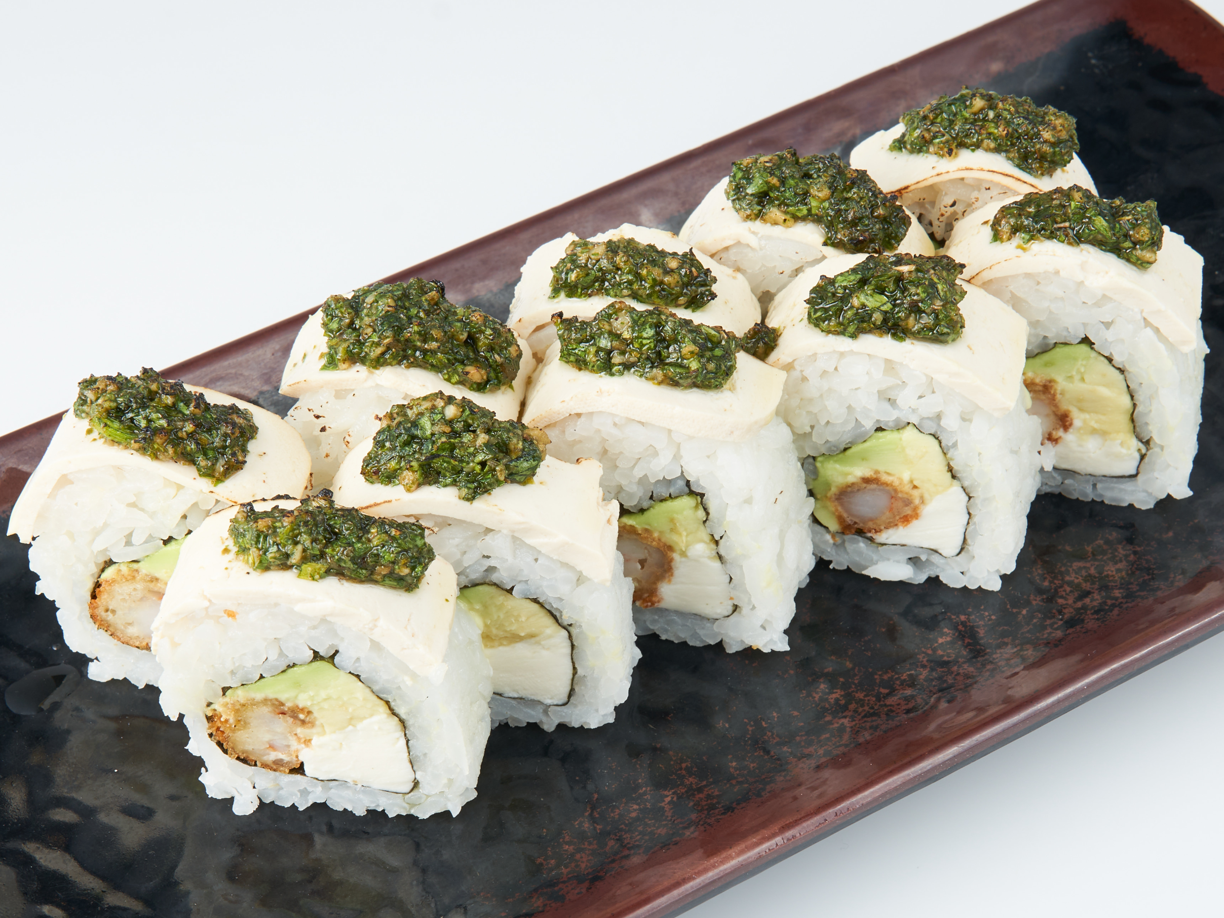Relleno de tofu empanizado, queso cream y palta, cubierto de tenkatsu (bolitas de tempura crujientes) bañado en salsa teriyaki y wasabimayo.