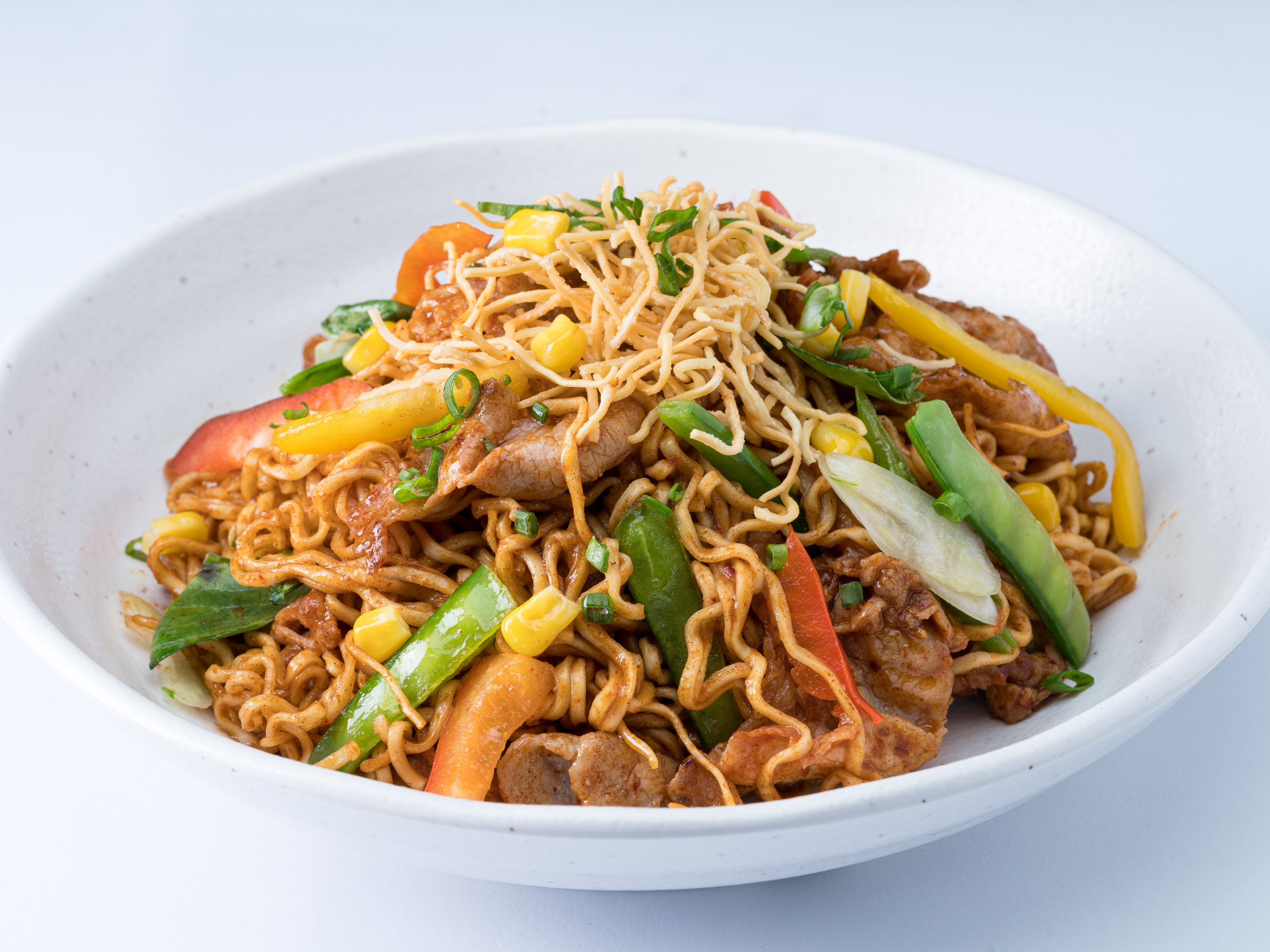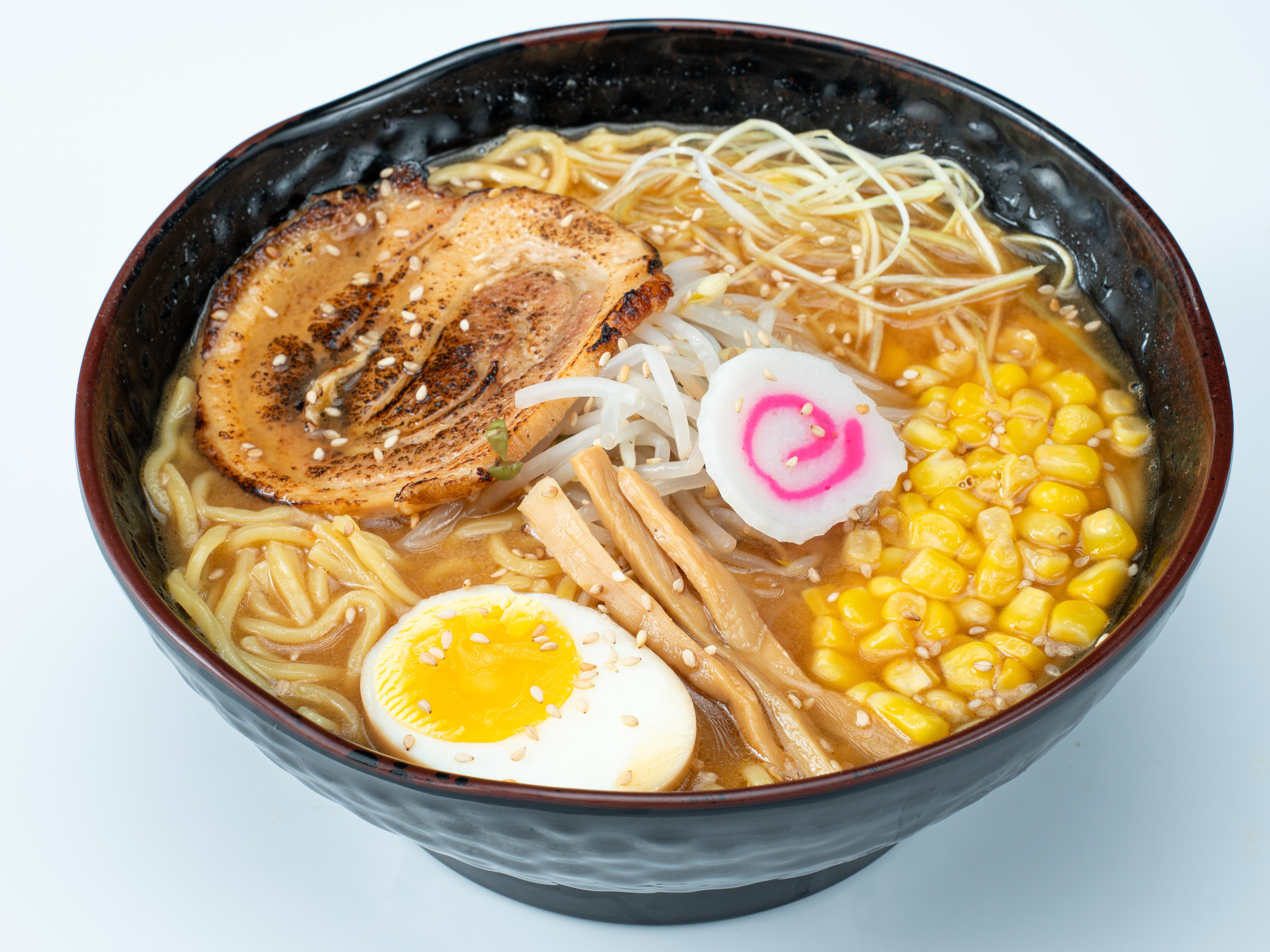 Sopa de fideo ramen japonés y caldo especial picante, acompañado de chashu (carne de cerdo), otras verduras.
