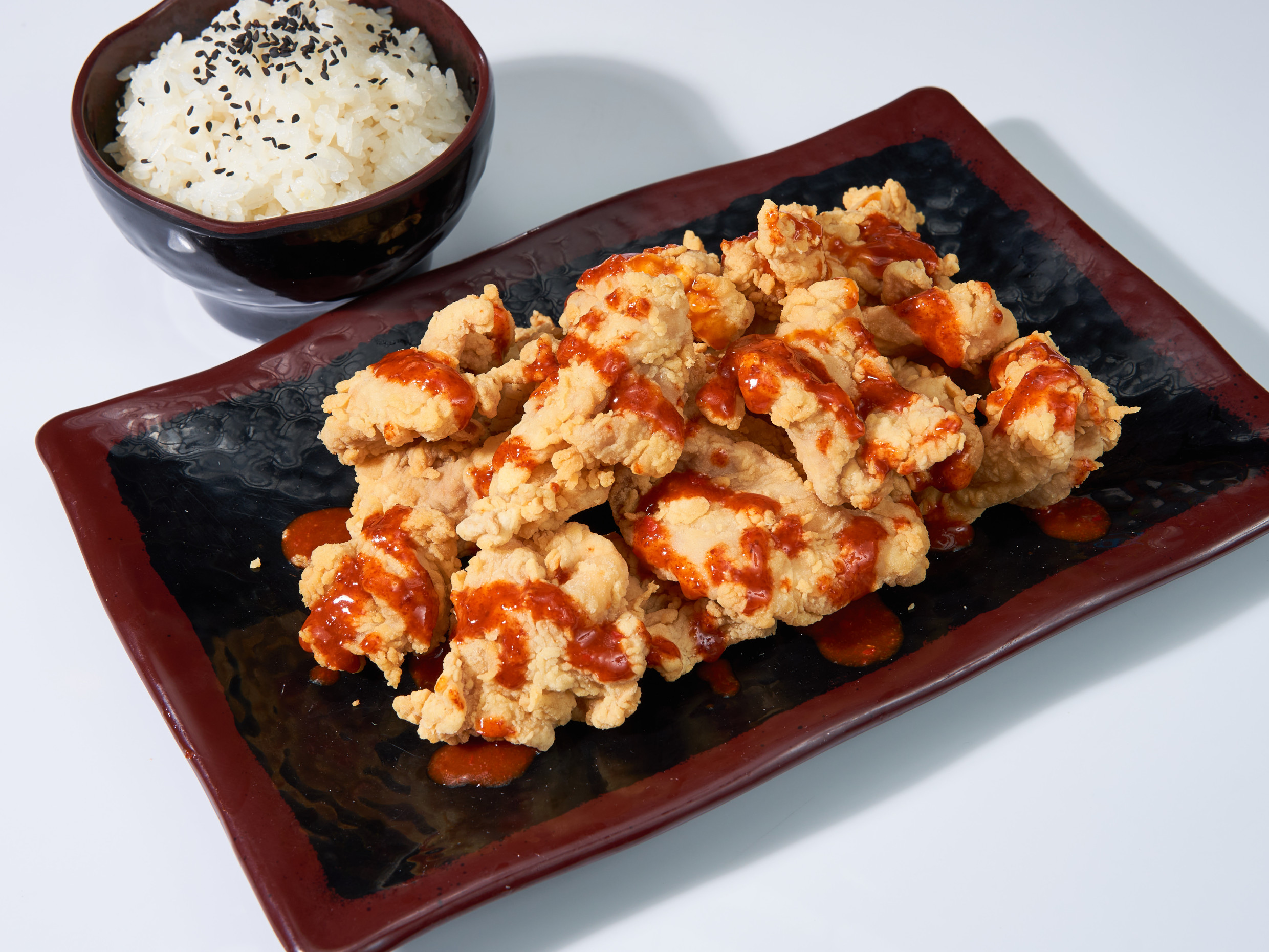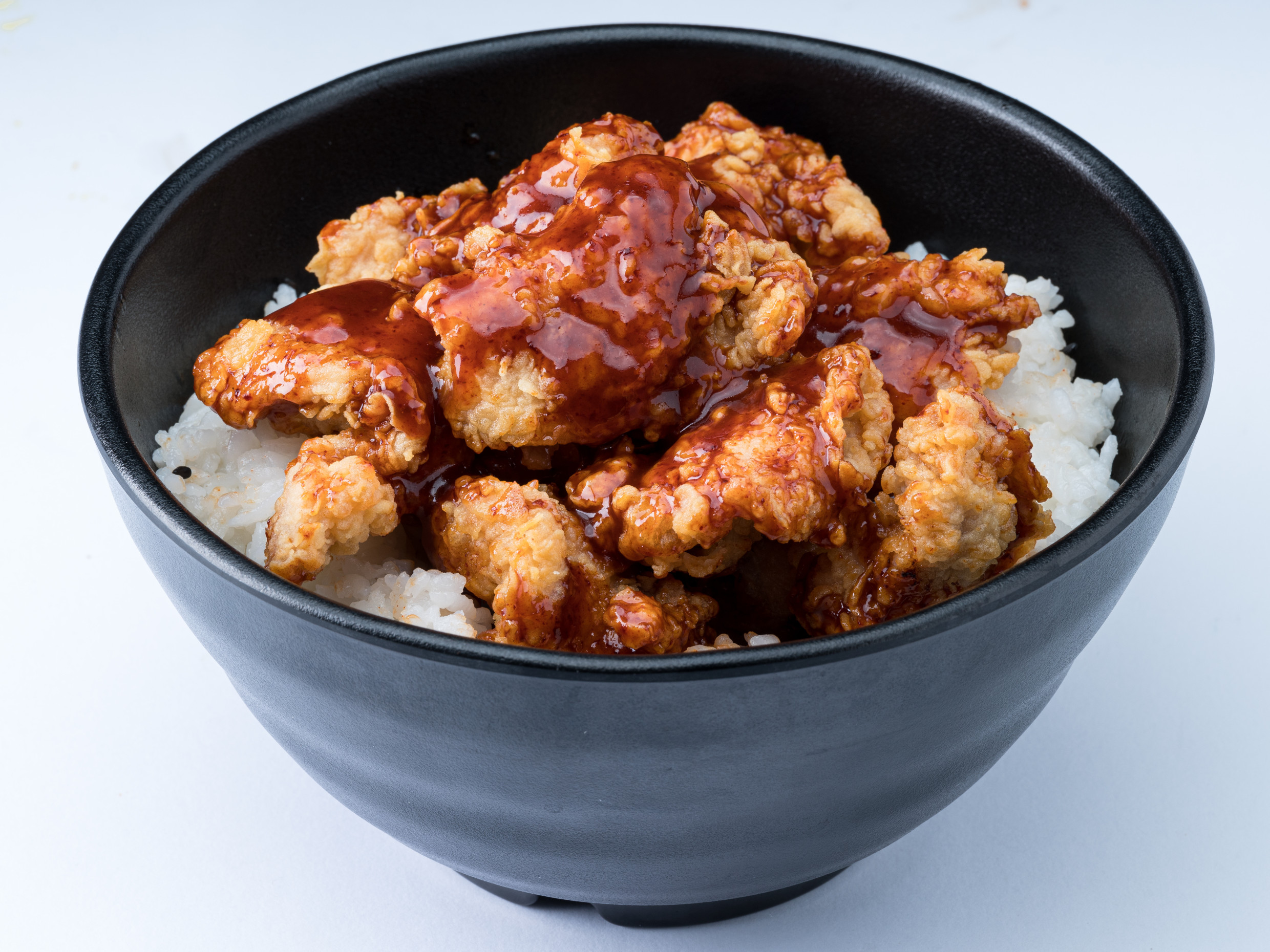 Trozos de pollo en salsa coreana clásica, sobre una cama de arroz.
