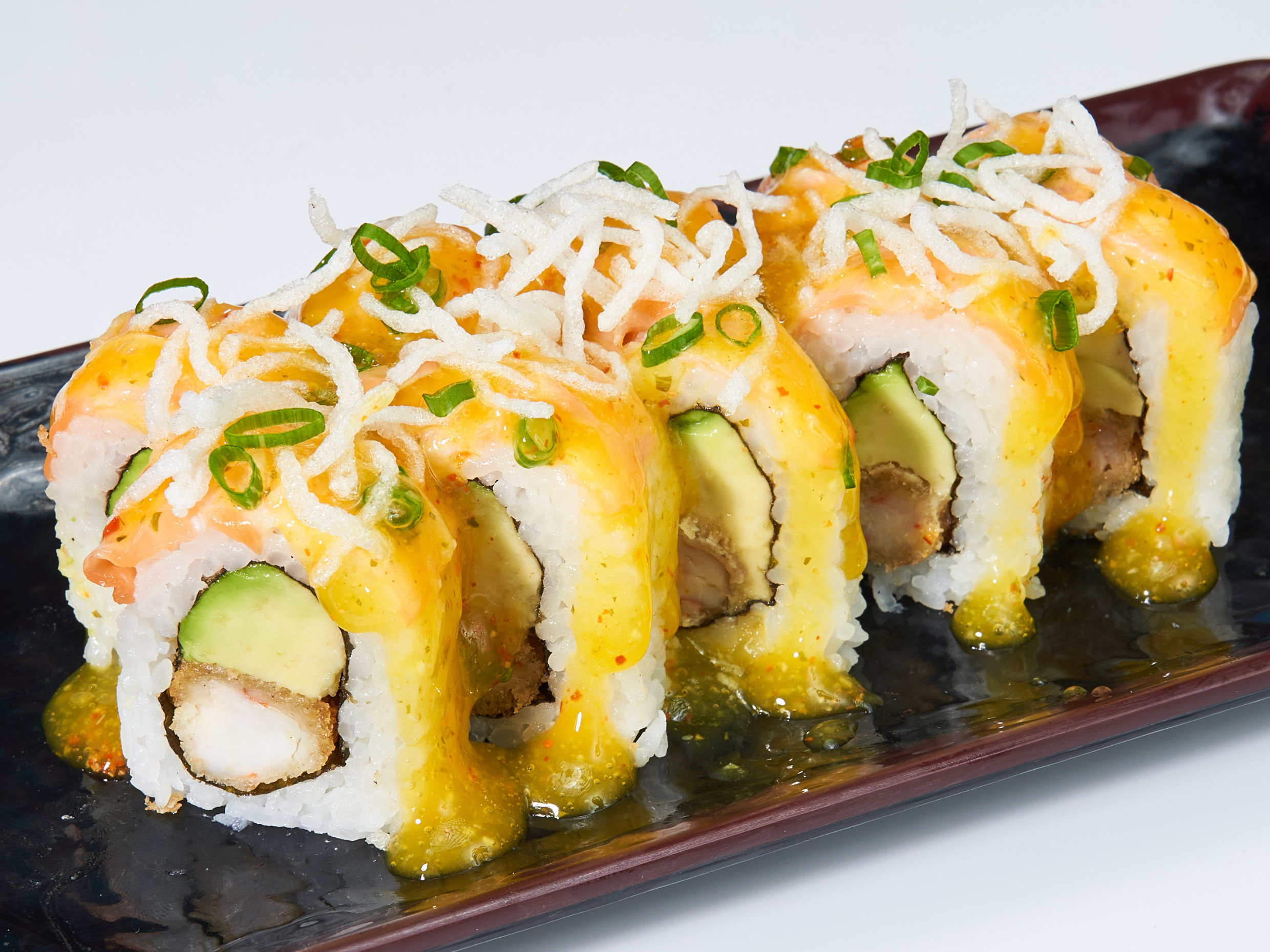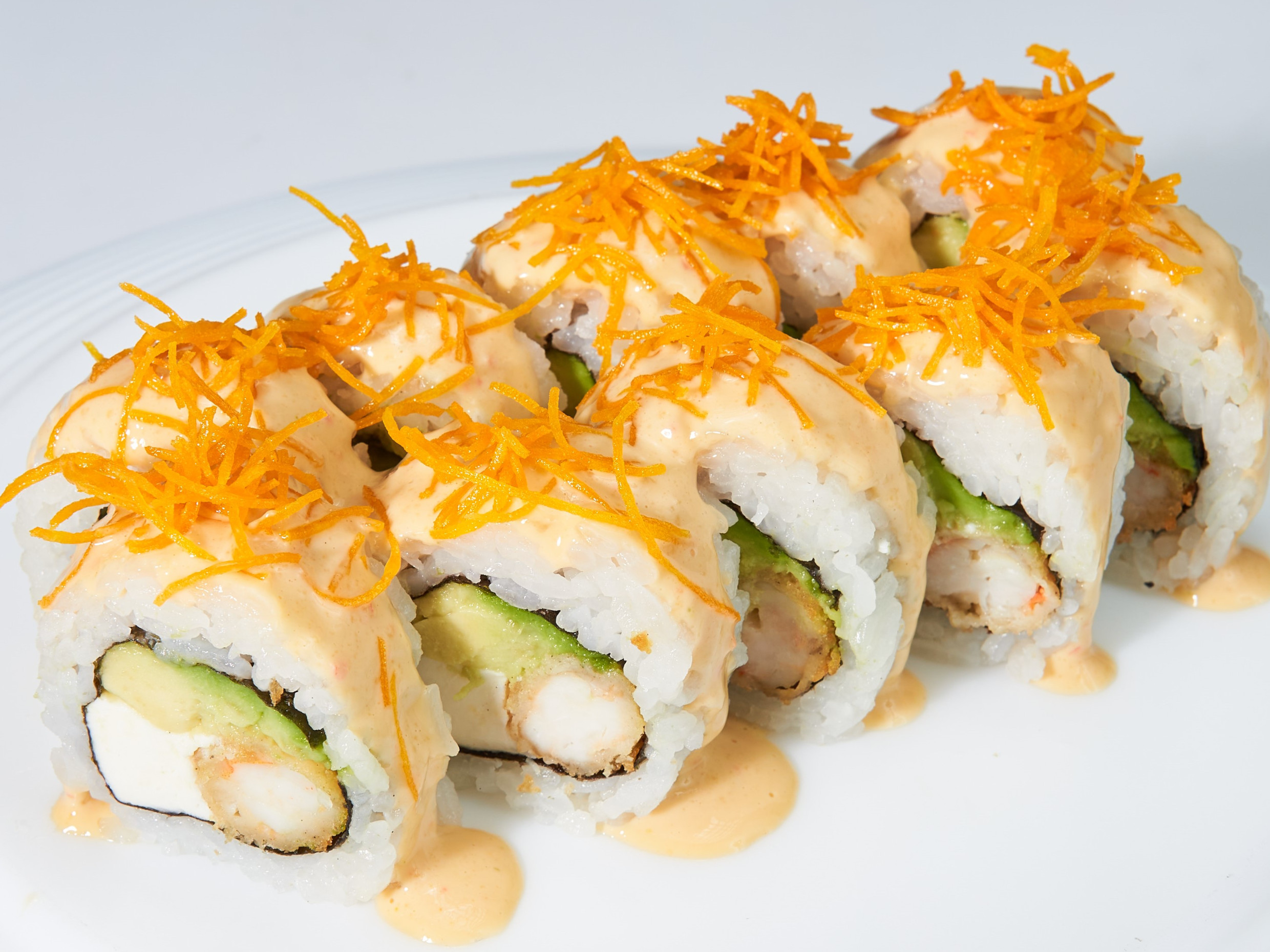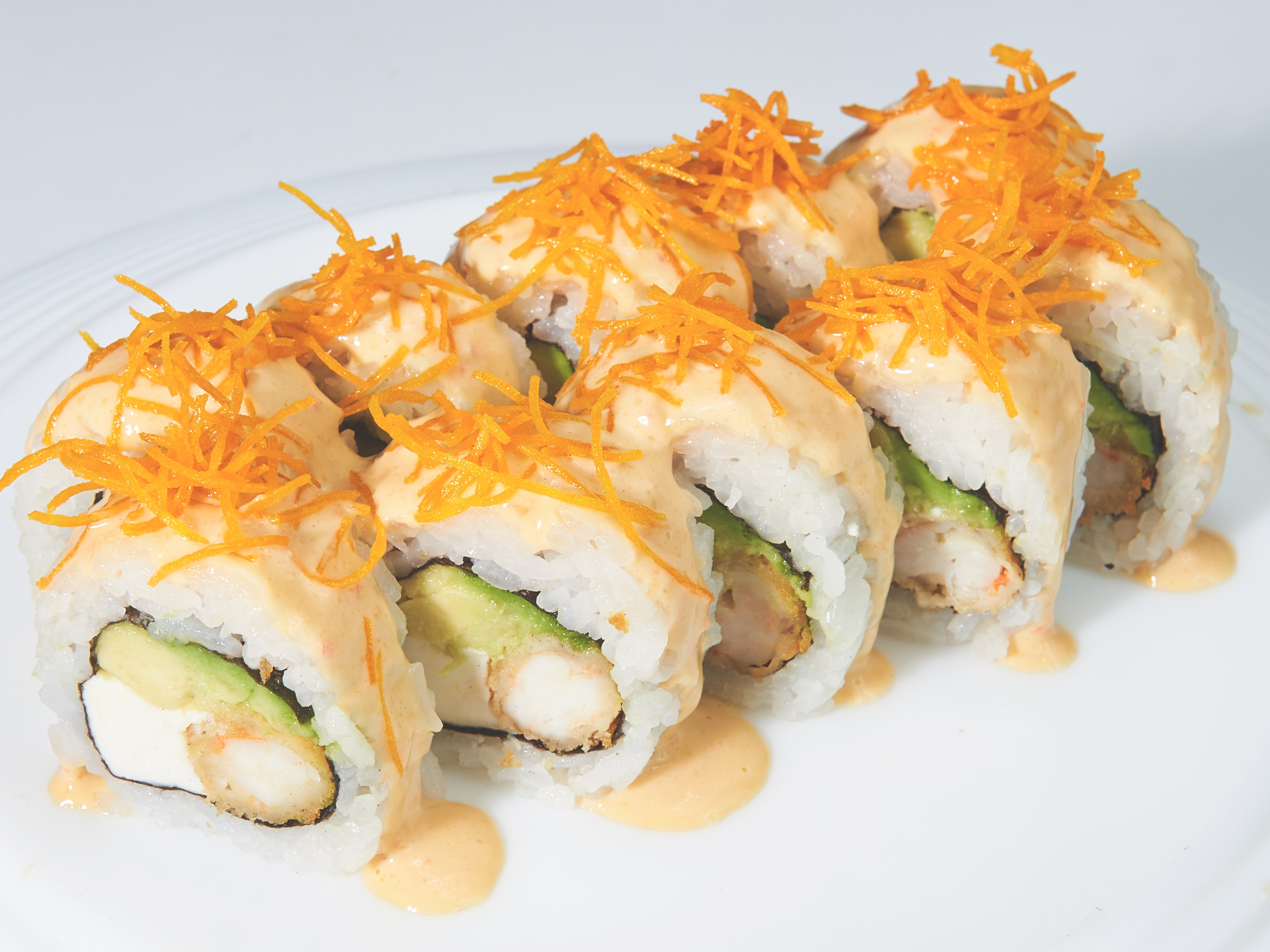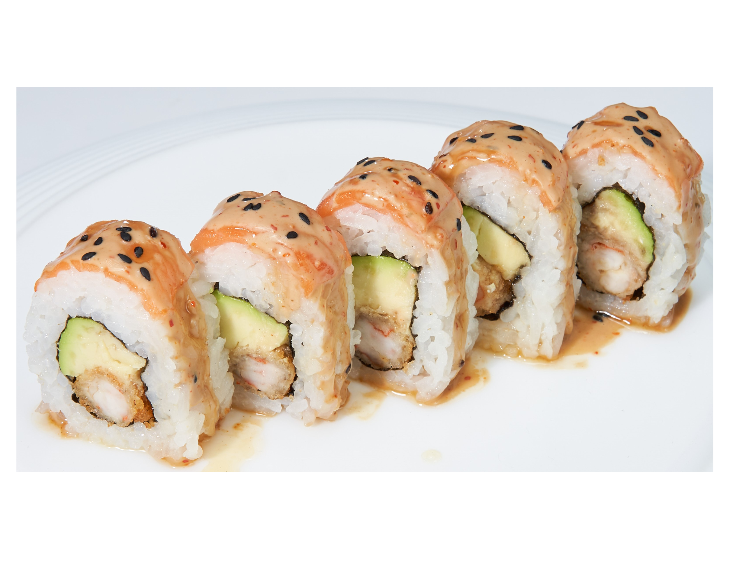Relleno de palta y langostino arrebozado, cubierto con salmón, bañado de nuestra salsa mayoshoyu y miel cítrica.