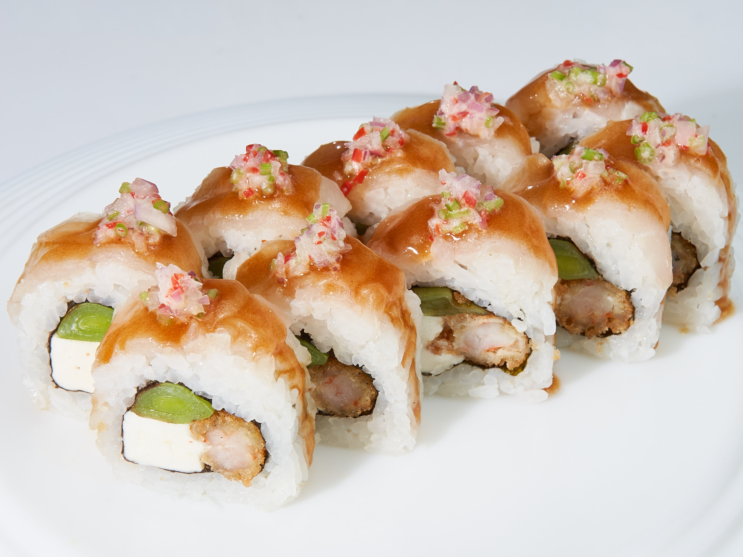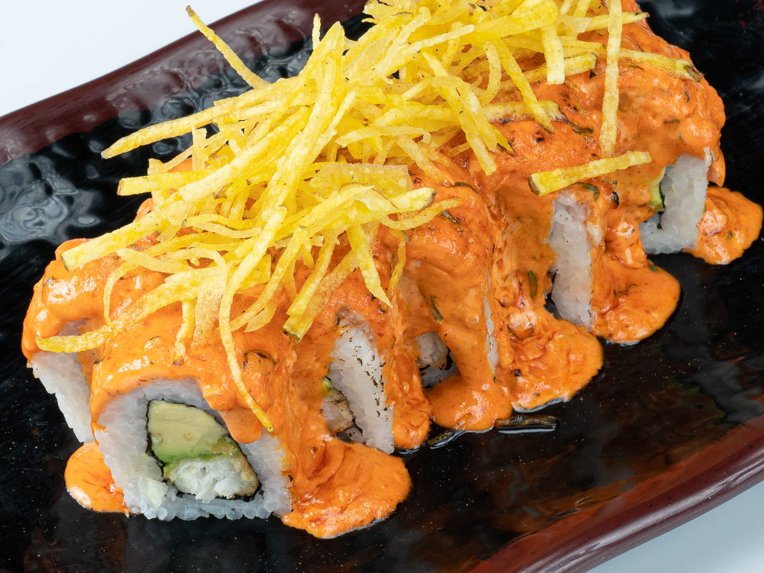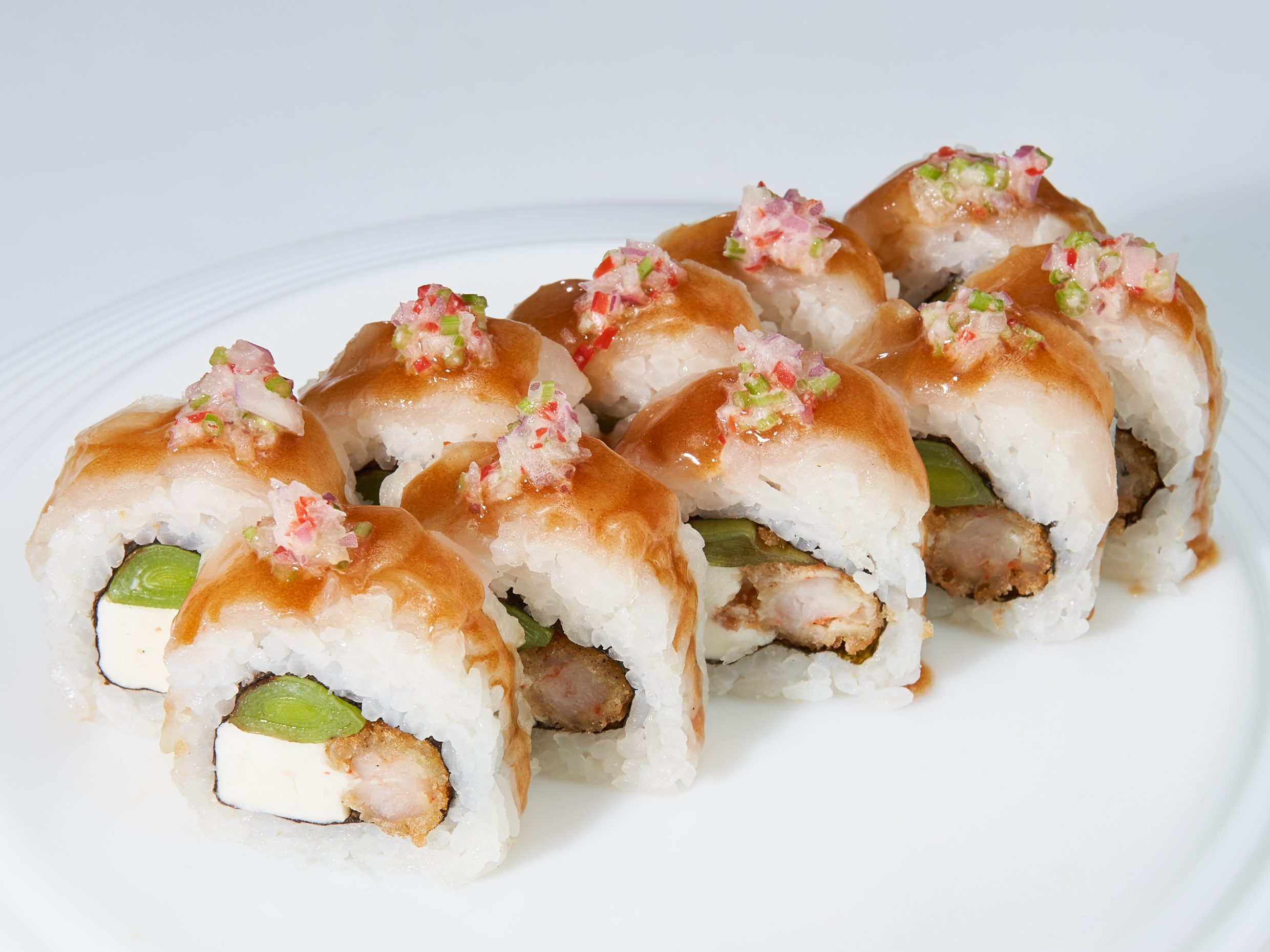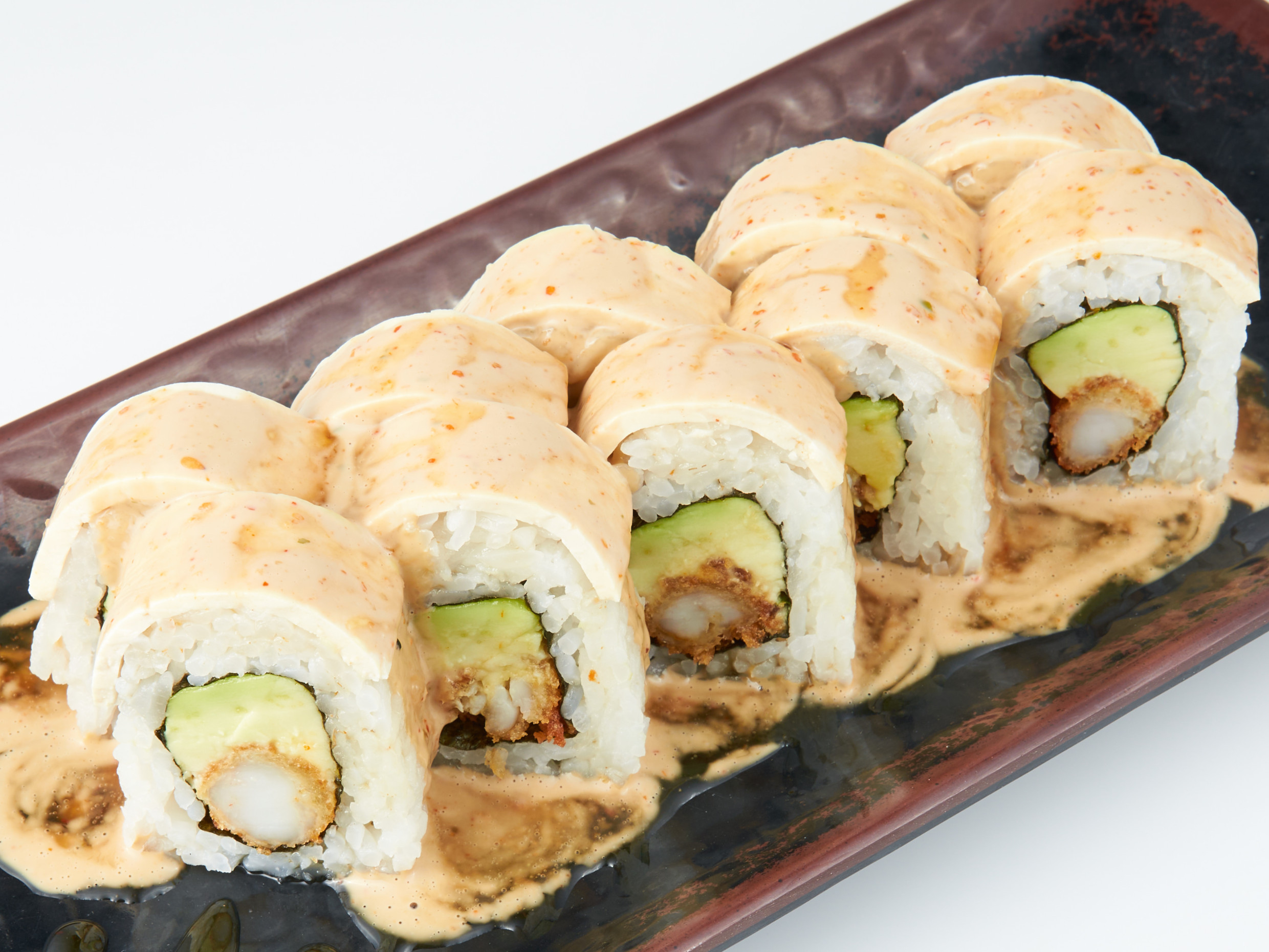 Relleno de palta y langostino arrebozado, cubierto con salmón, bañado de nuestra salsa mayoshoyu y miel cítrica.