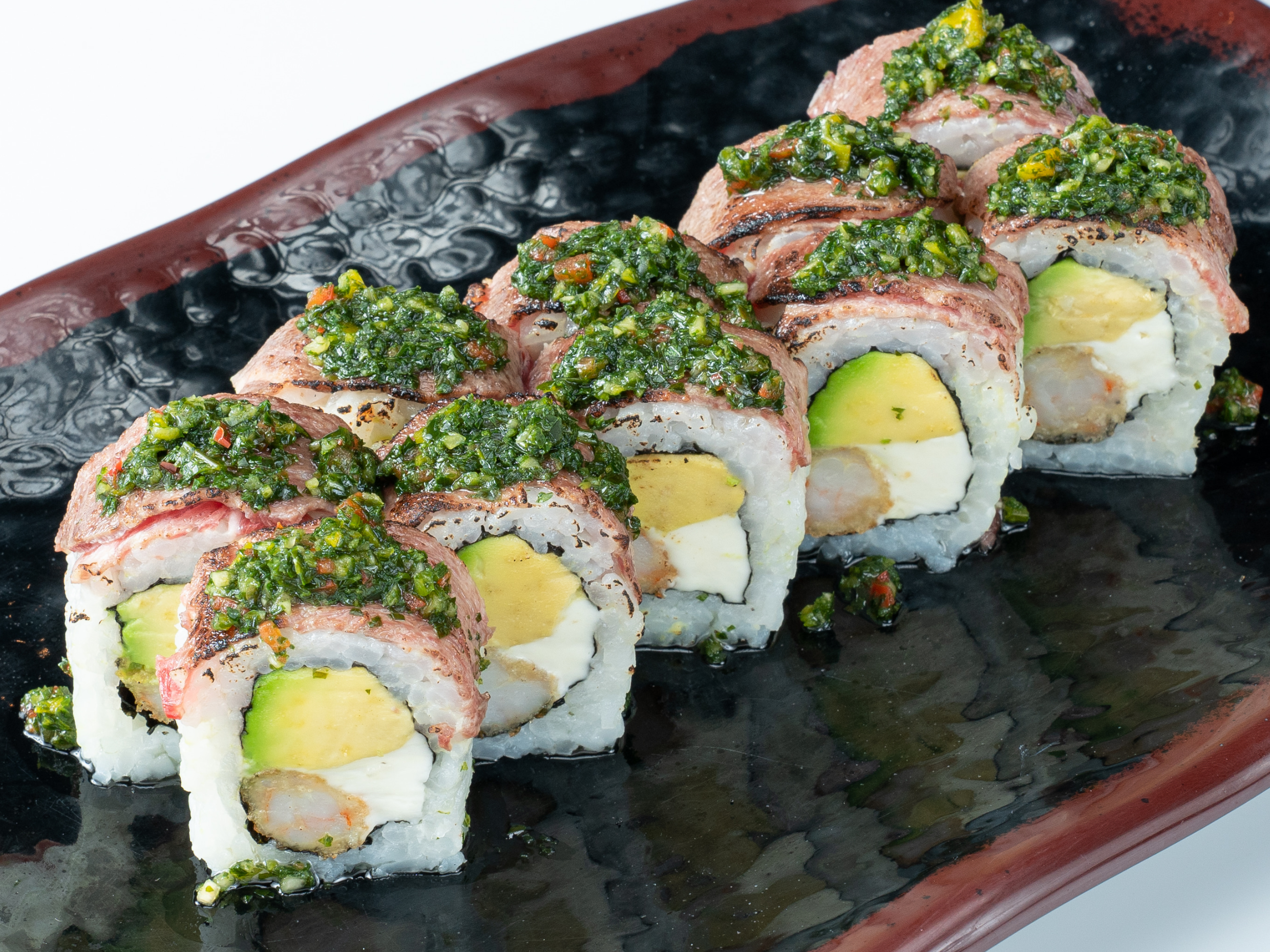 Relleno de langostino empanizado, palta y queso crema, cubierto de lomo fino flameado y salsa chimichurri.