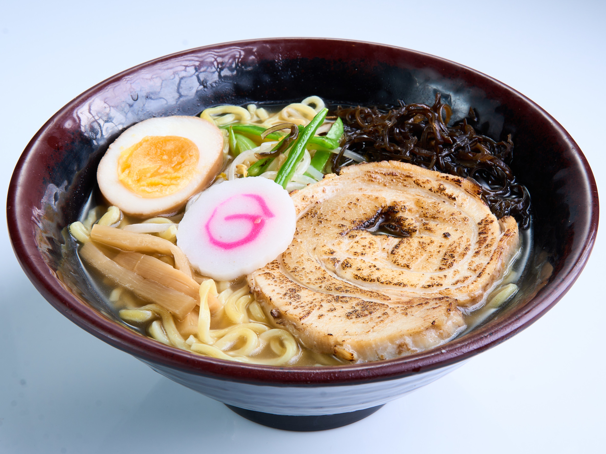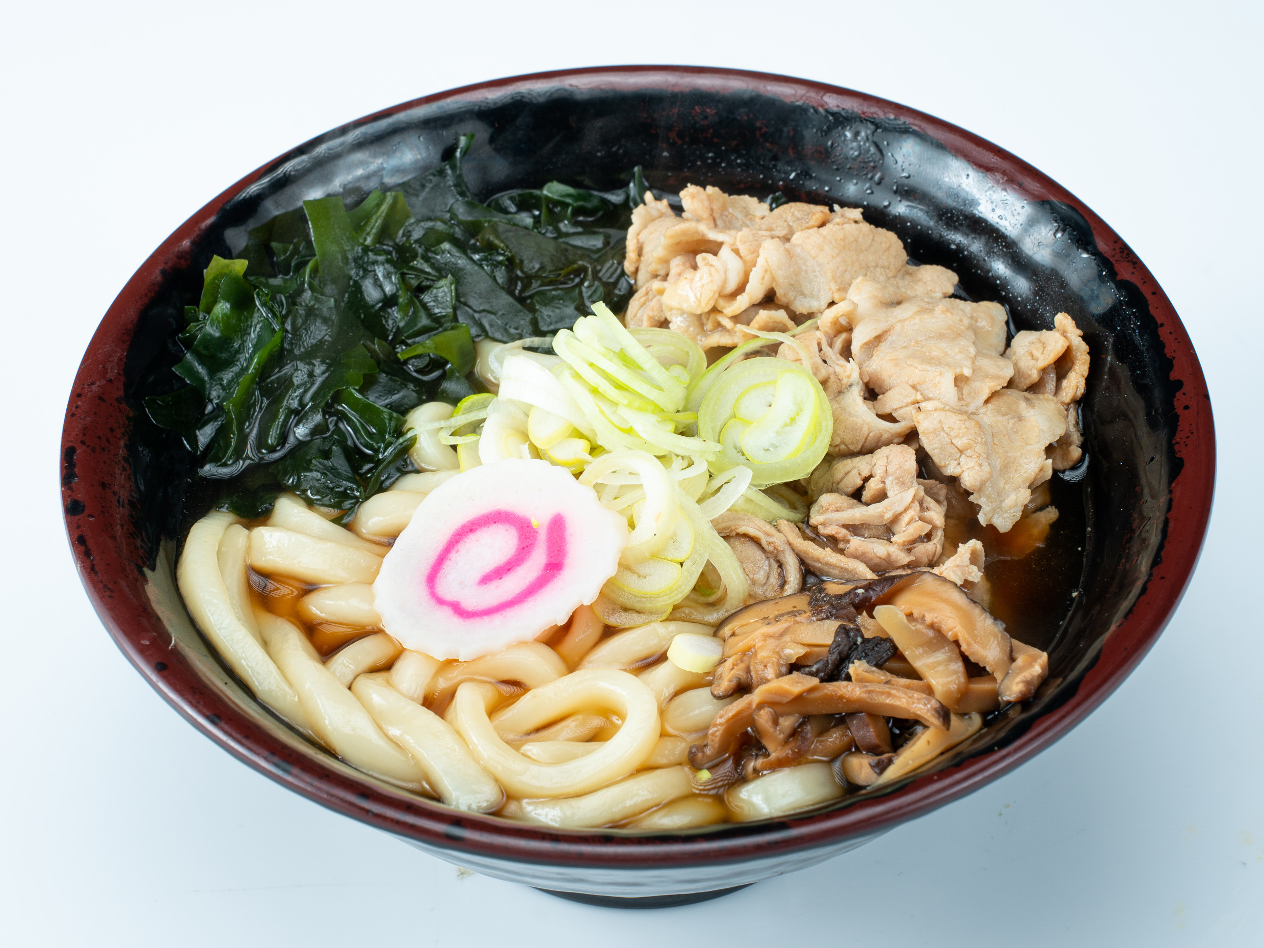 Sopa de fideo udón japonés con caldo a base de dashi, acompañado de chashu (carne de cerdo), algas y verduras.