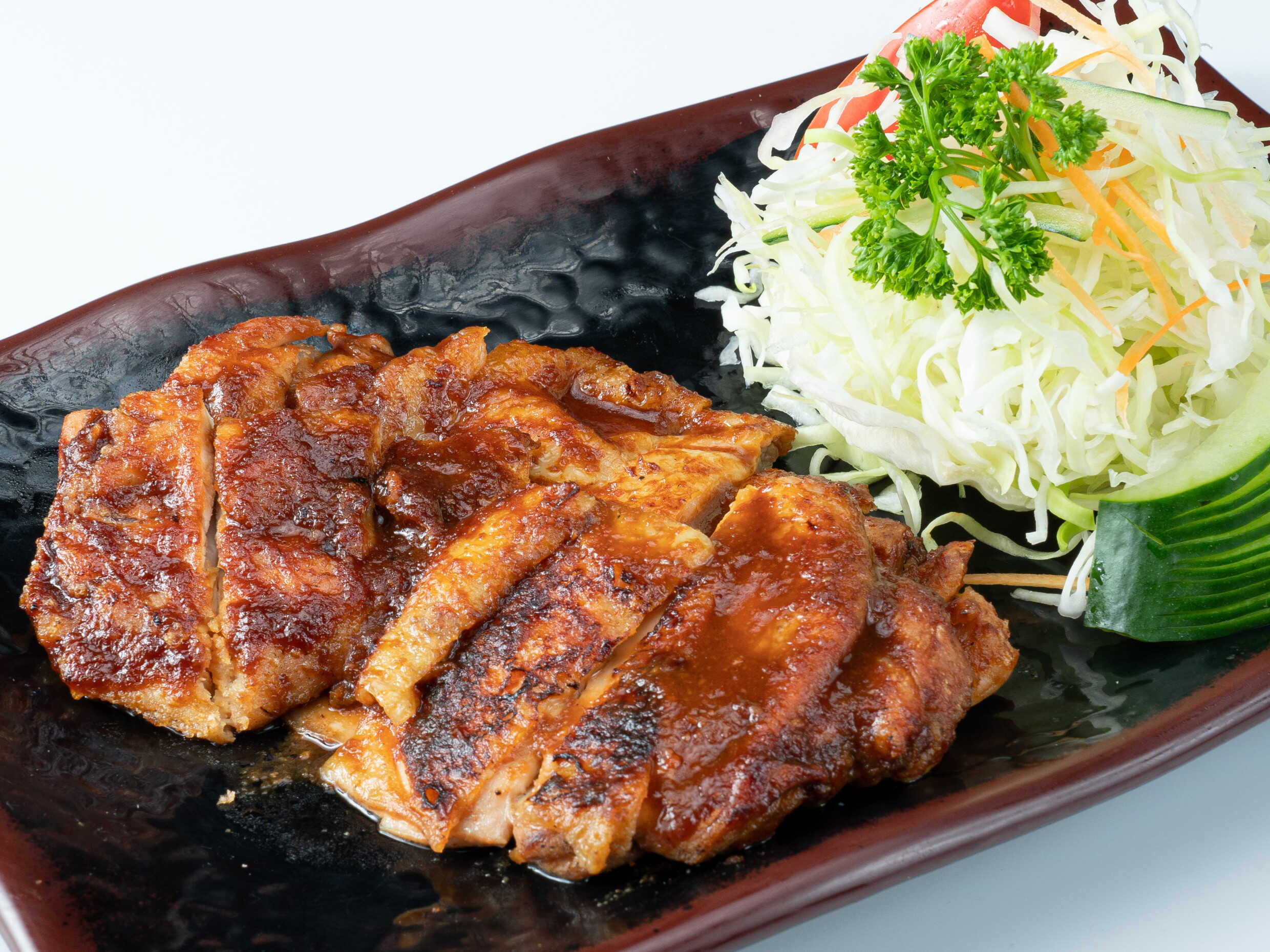 Filete de pollo a la plancha glseada en salsa miso, acompañado de ensalada de col y arroz japones.