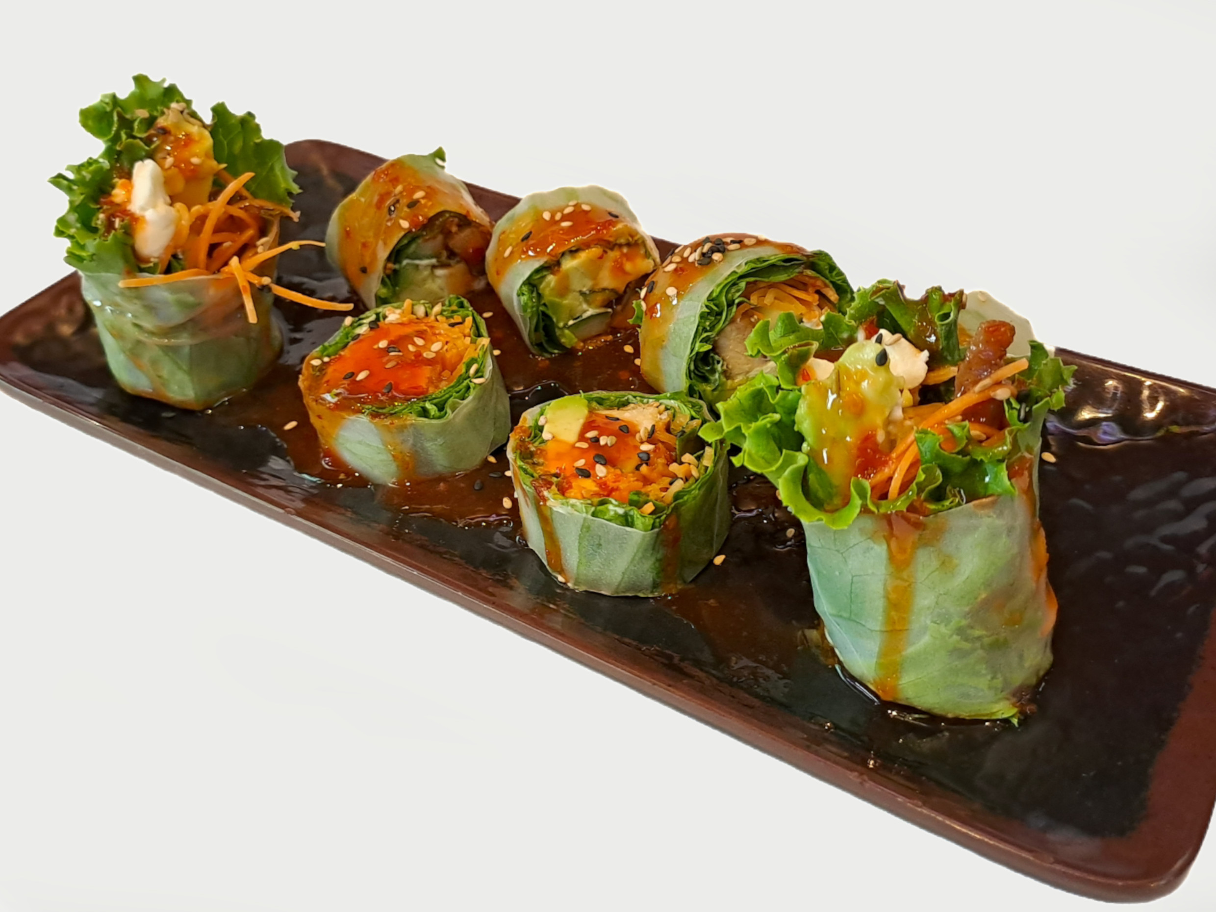Rollo relleno de pollo teriyaki, queso crema y verduras frescas envuelto en papel de arroz, bañadas en salsa agridulce con un toque picante.