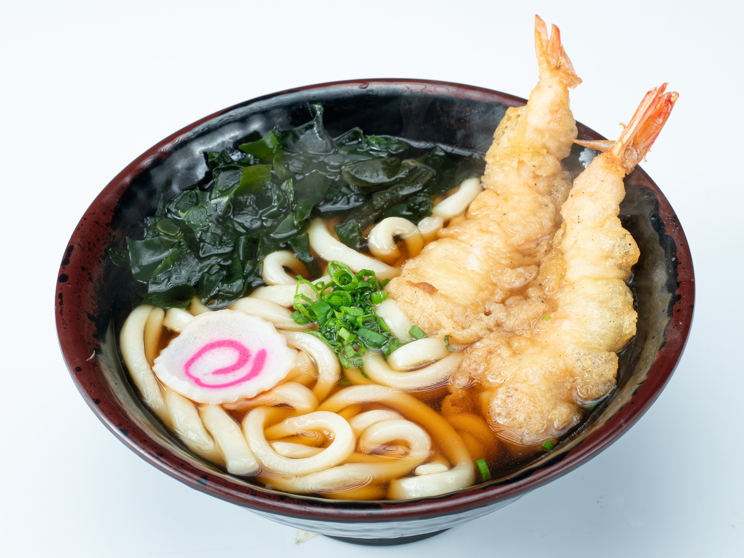 Sopa de fideo udón japonés con caldo a base de dashi, acompañado de ebi tempura (langostinos arrebozados), algas y verduras.