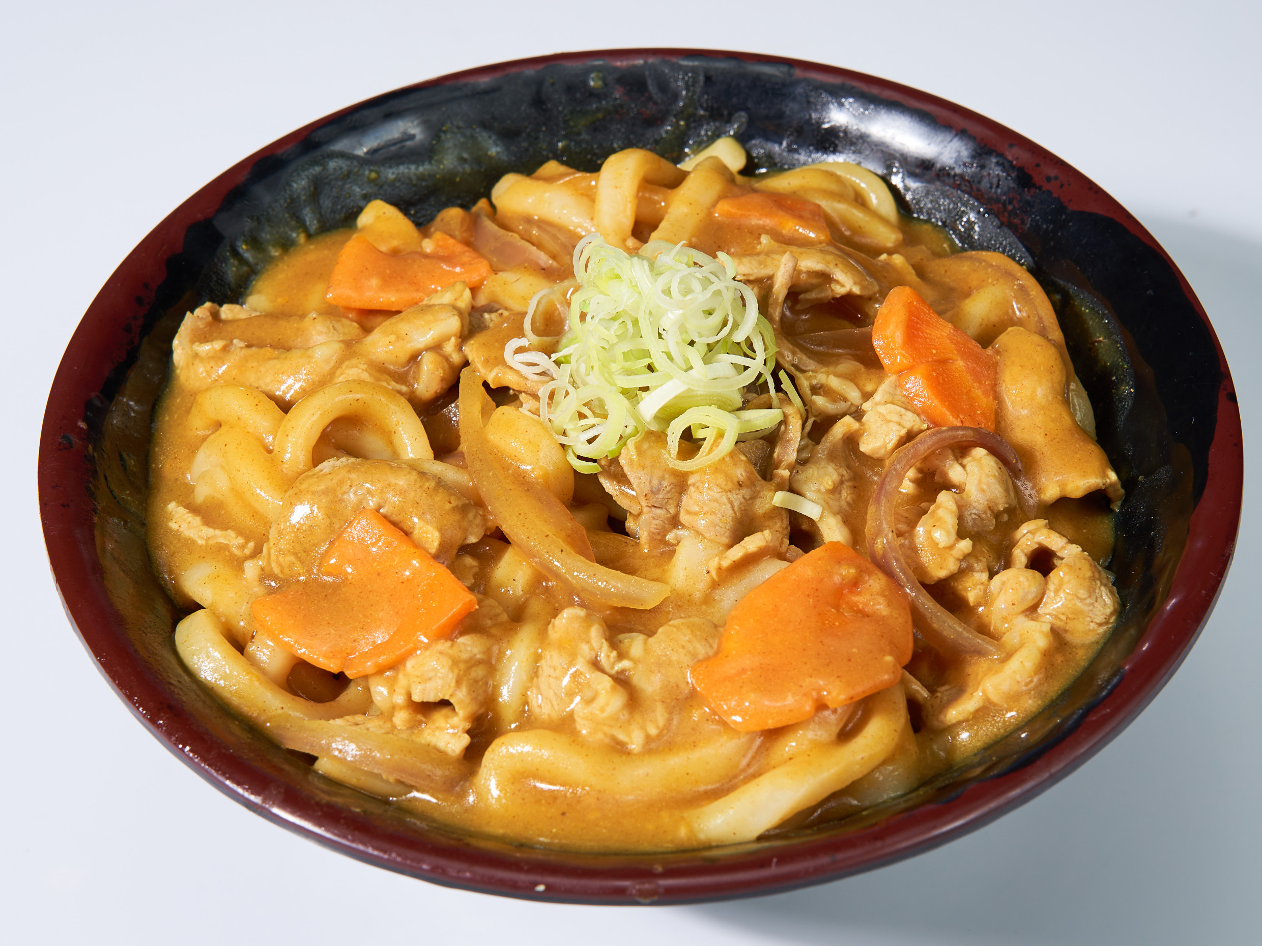Fideos udón acompañado con guiso de curry con carne de cerdo y verduras.