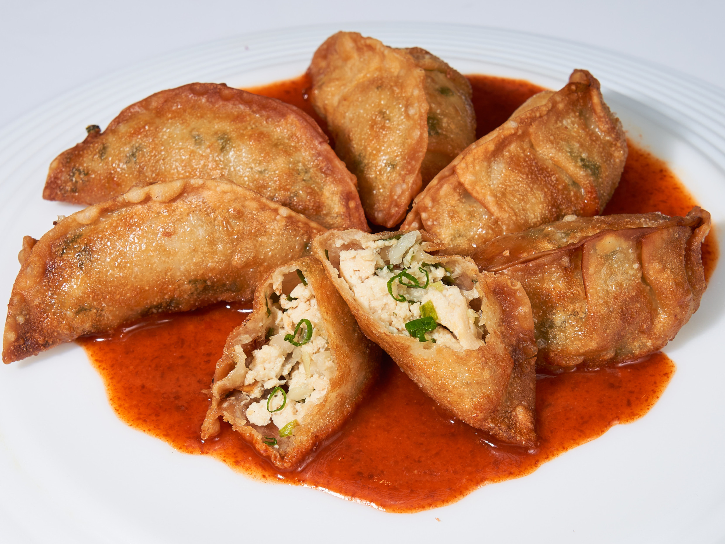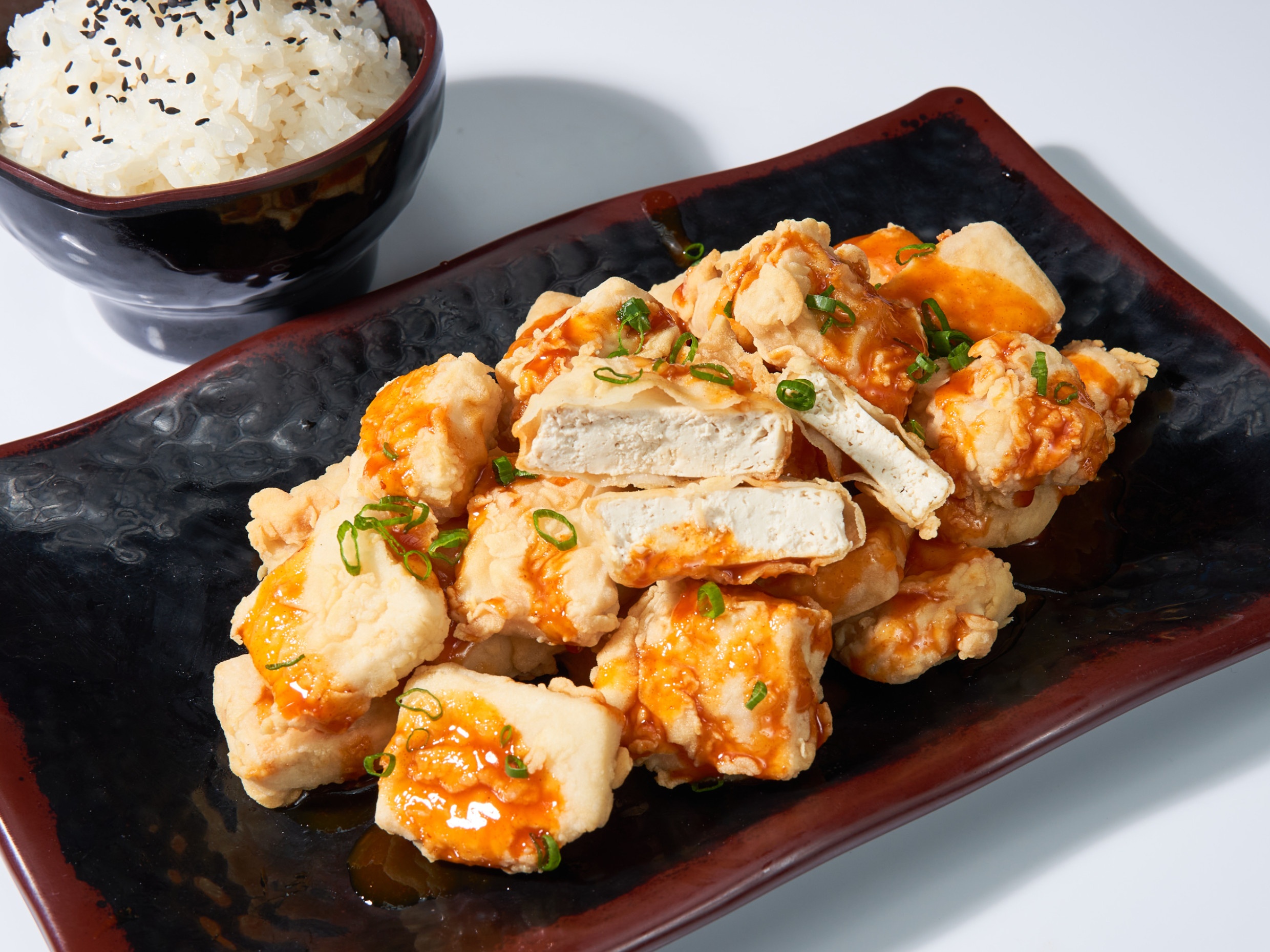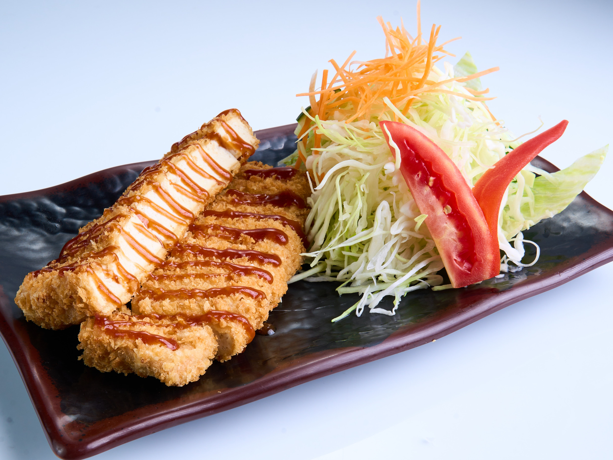 Relleno de tofu, queso crema y palta, empanizado y frito, acompañado de salsa teriyaki.