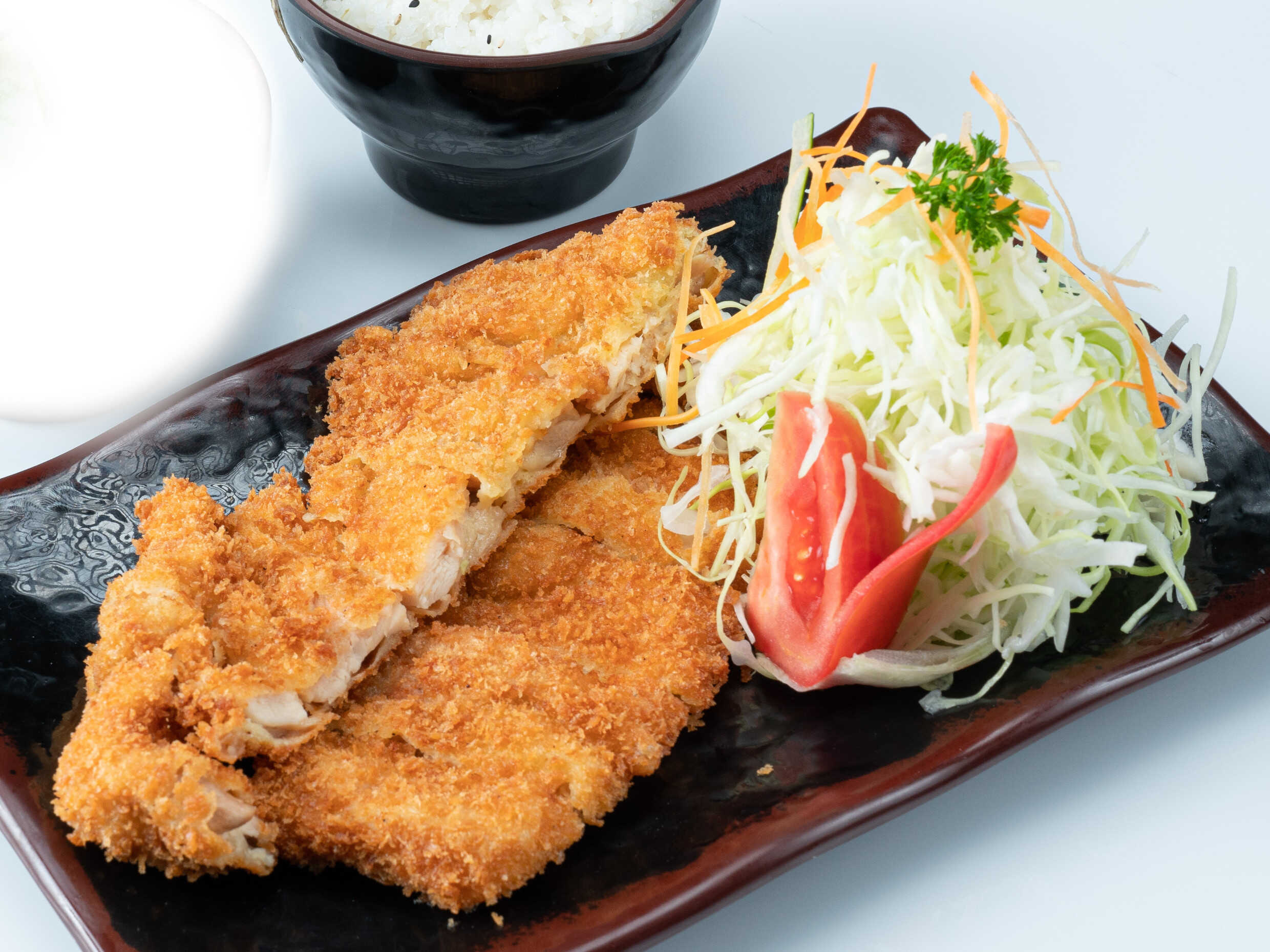 Pollo empanizado al panko, acompañado de ensalada de col y arroz japonés.