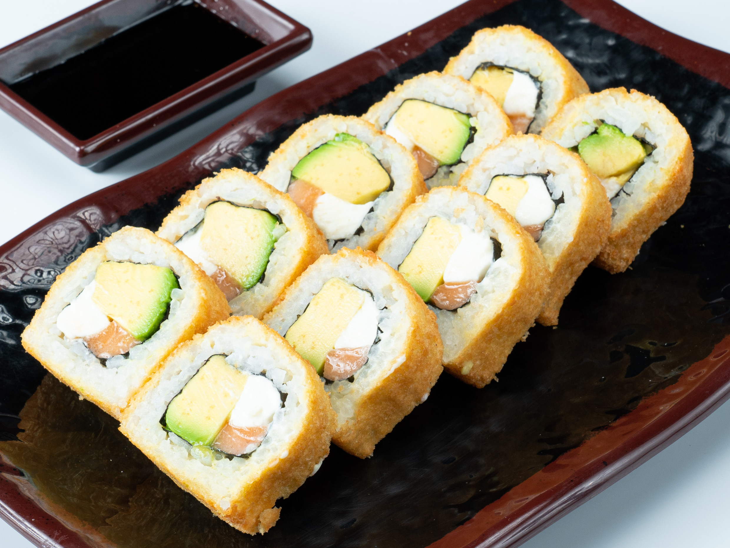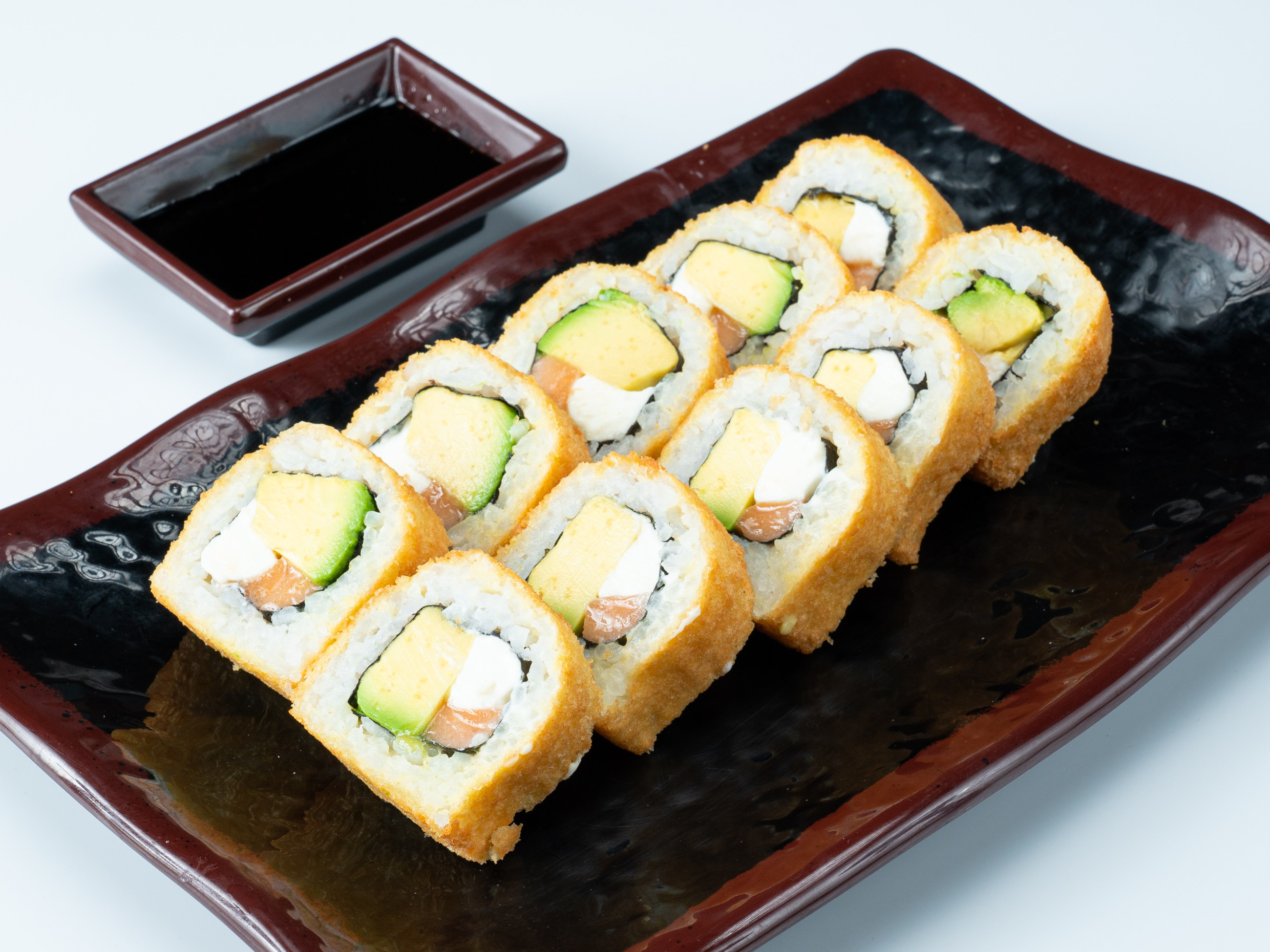 Relleno de salmón, queso crema y palta, empanizado y frito, acompañado de salsa teriyaki.