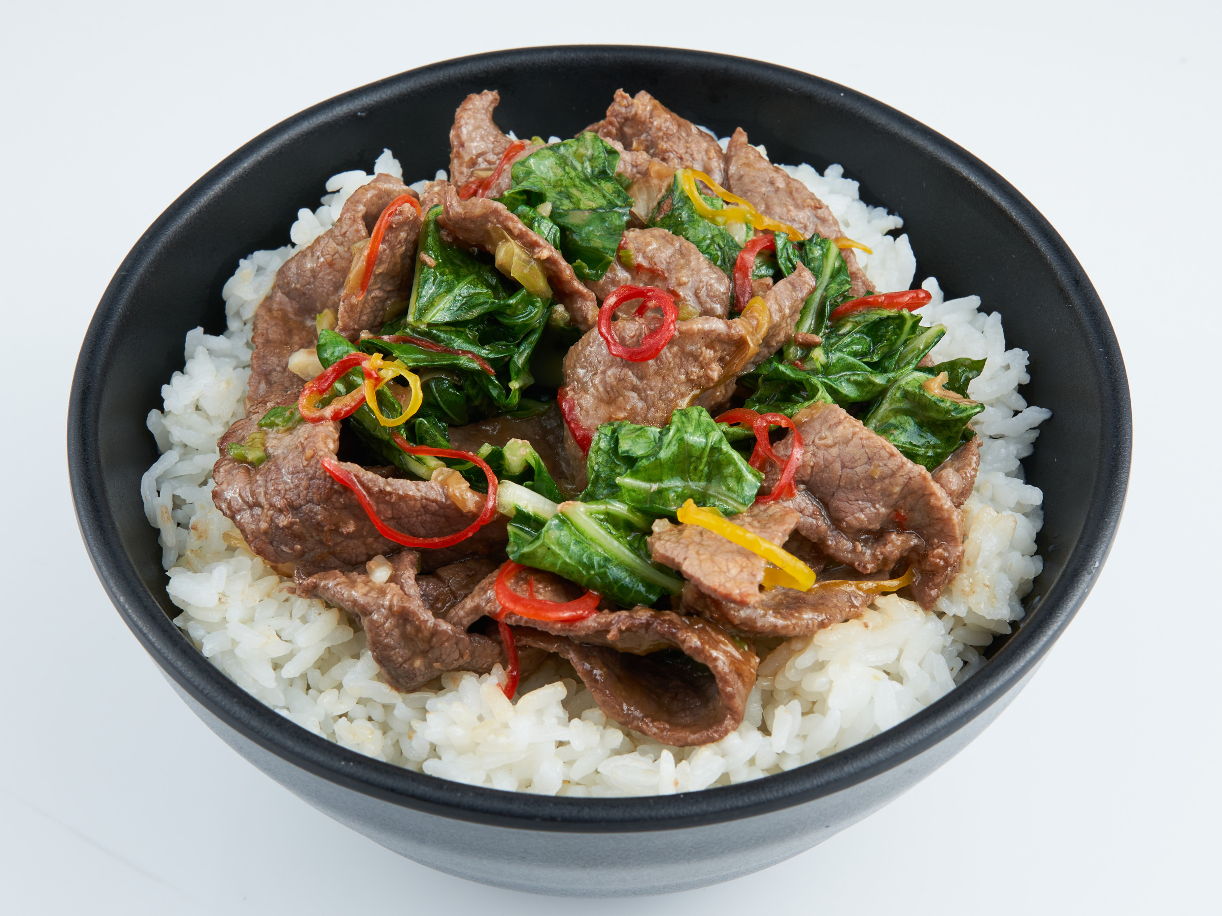 Láminas de carne de res salteadas en salsa de ajo, sobre una cama de arroz.