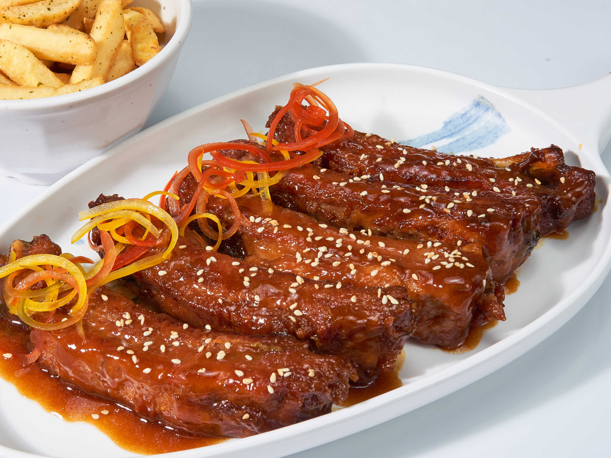 Deliciosa y jugosas costillas en salsa thailandesa con una porción de papas fritas.