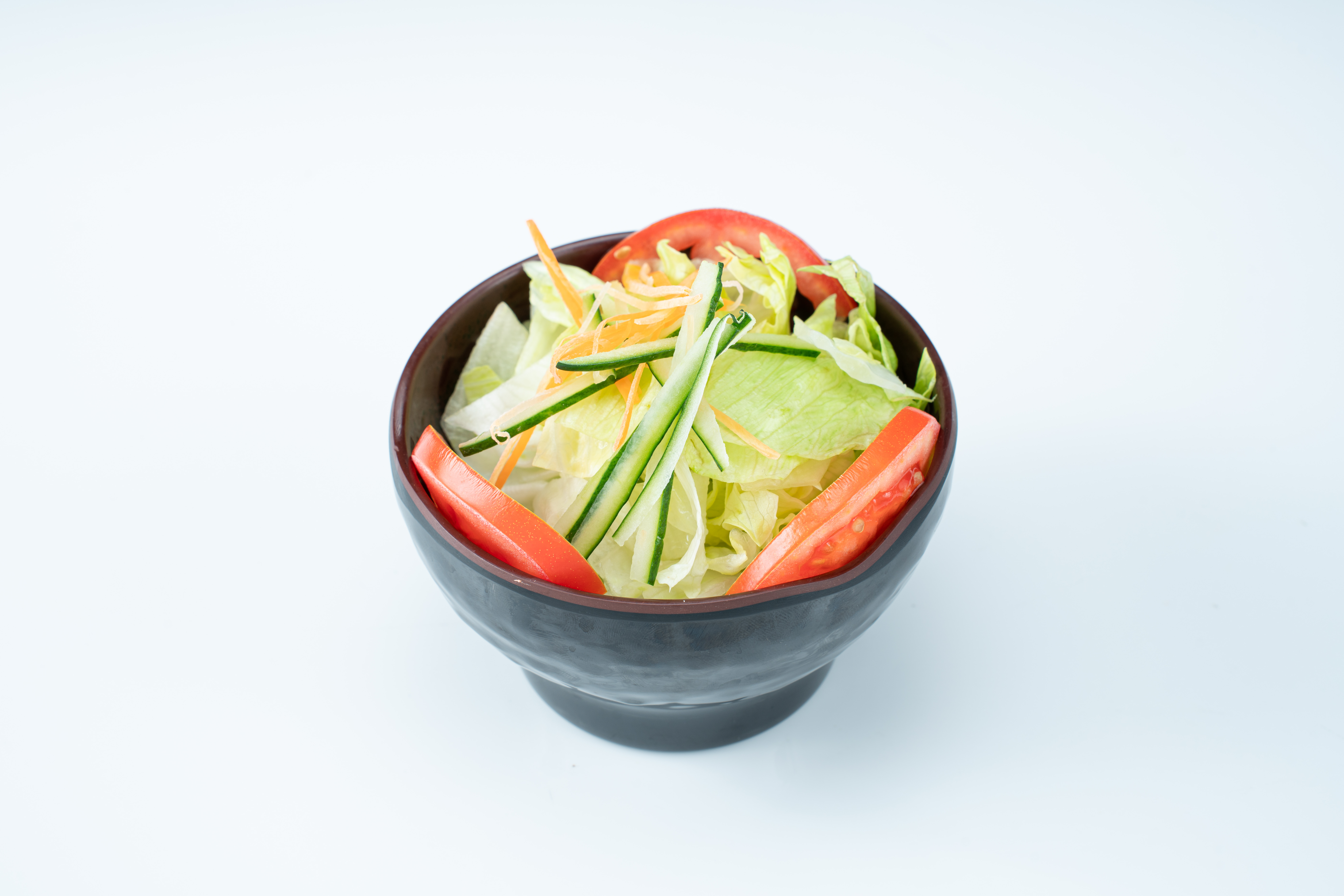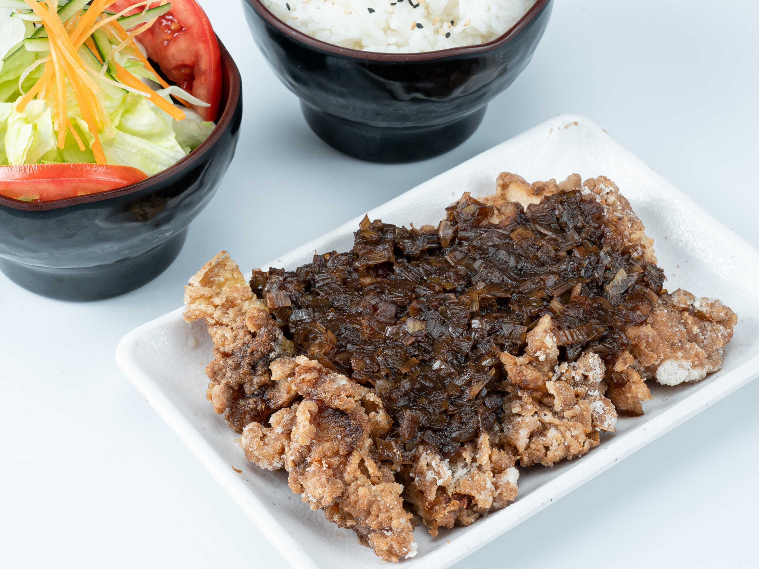 Pollo frito crocante bañado en salsa negui (poro japonés) de ensalada de verduras con salsa miso y arroz japonés.