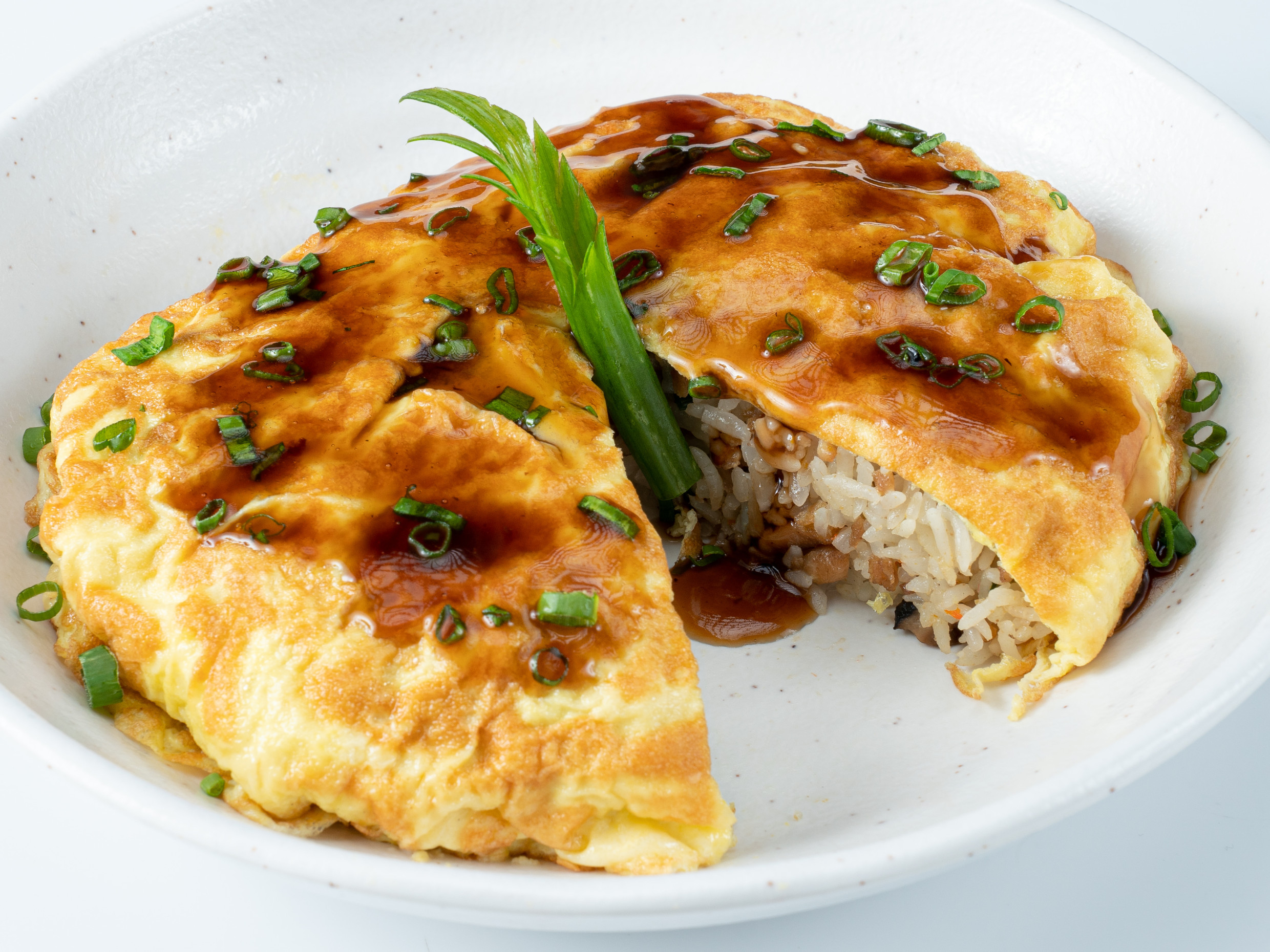 Arroz frito con pollo y verduras, envuelto en tortilla de huevos bañado en salsa shiitake (hongo japonés).
