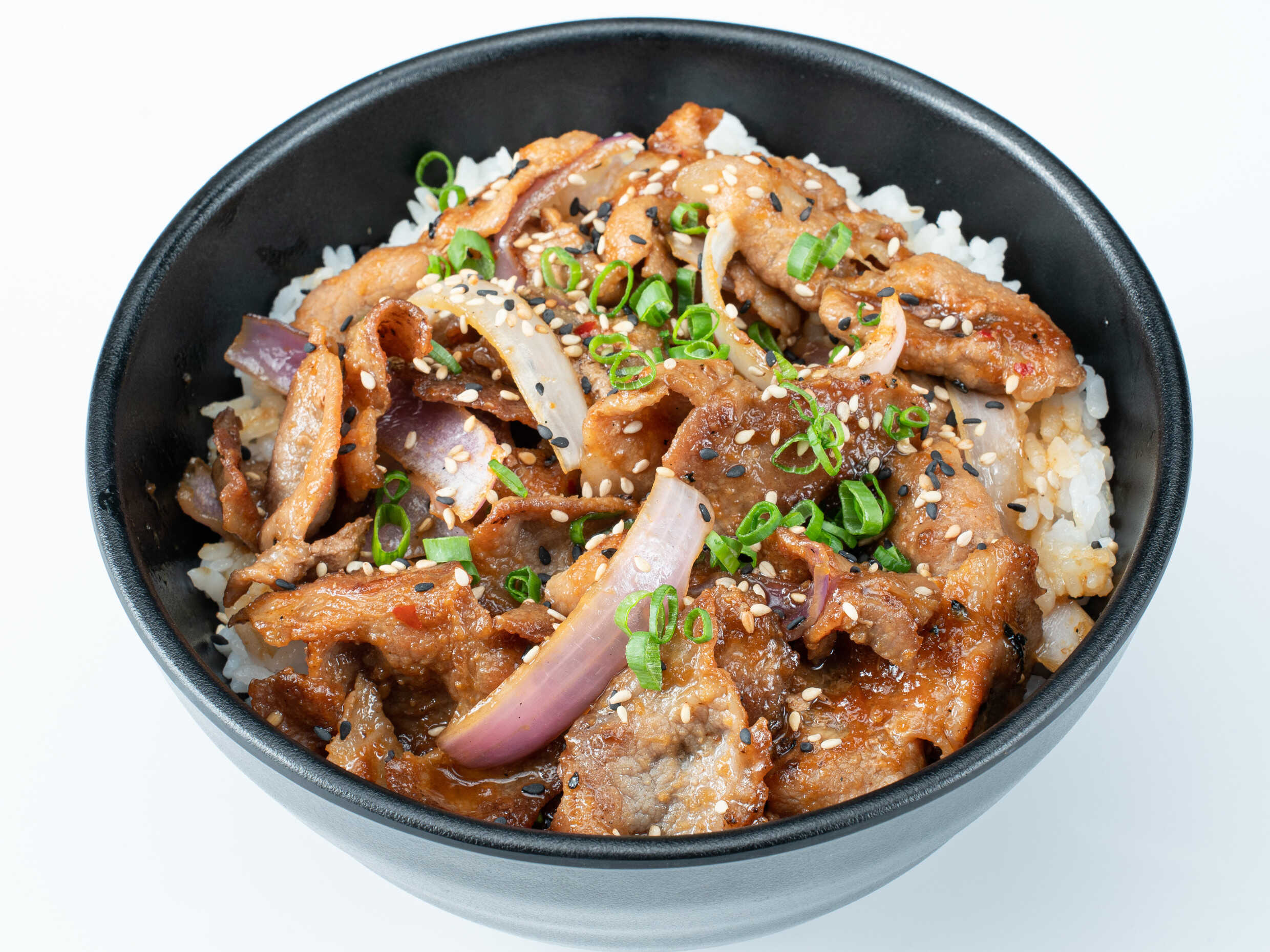 Carne de cerdo empanizado, acompañado de gajos de cebolla y huevos cocidos en salsa ligeramente dulce, servido sobre una cama de arroz.