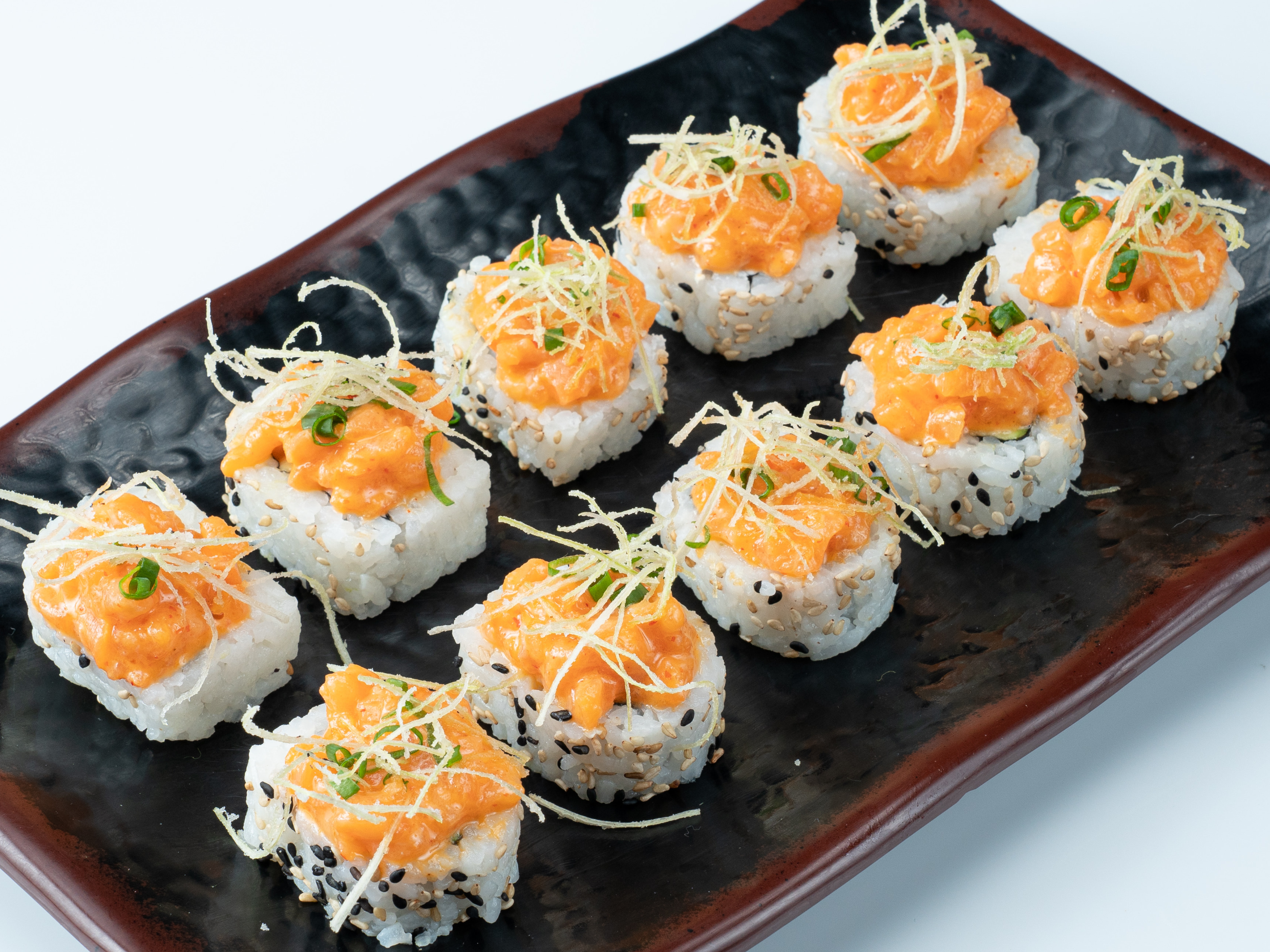 Relleno de palta , queso crema y kiuri, cubierto de tartare de salmón ligeramente picante con poro frito.