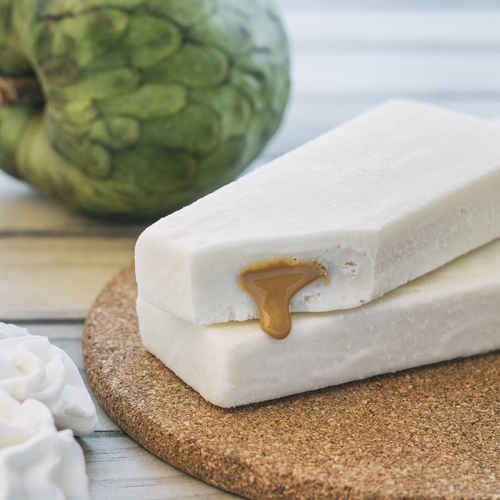 Helado tipo paleta de chirimoya con pedazos de merengue, rellena de manjar blanco.